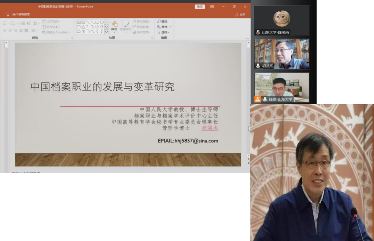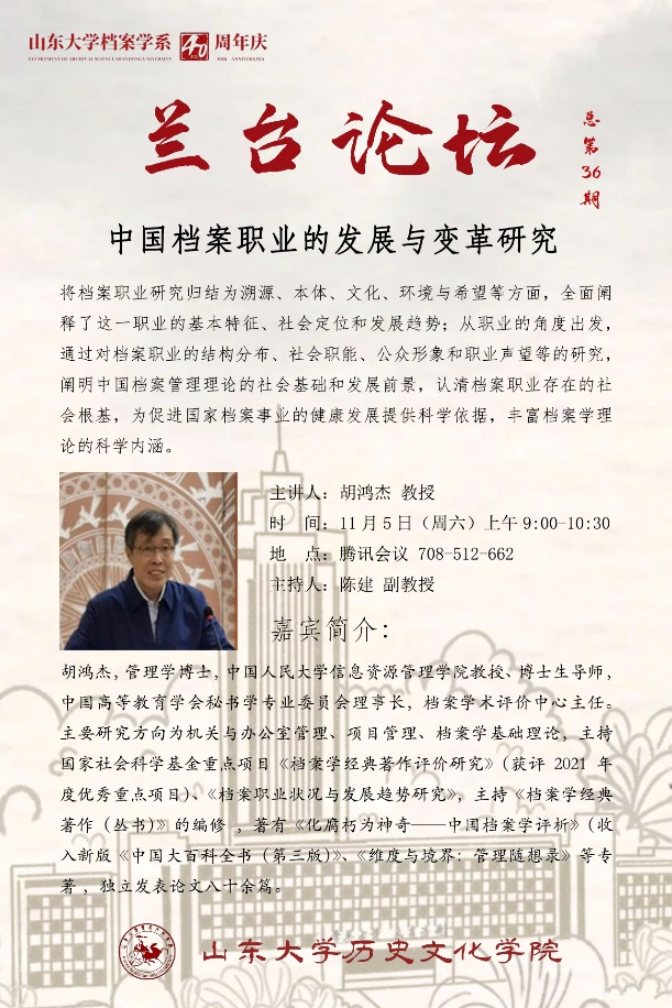 11月5上午,中国人民大学信息资源管理学院教授、博士生导师胡鸿杰教授应邀为我院师生作题为“中国档案职业的发展与变革研究”的学术报告(线上)。此次报告是兰台论坛第36期,同时也是太阳成tyc122cc集团档案学系40周年庆(1982-2022)系列活动之一。报告由太阳成tyc122cc集团历史文化学院档案学系主任陈建副教授主持,来自全国档案学界和业界的师生同仁120余人参加了报告会。