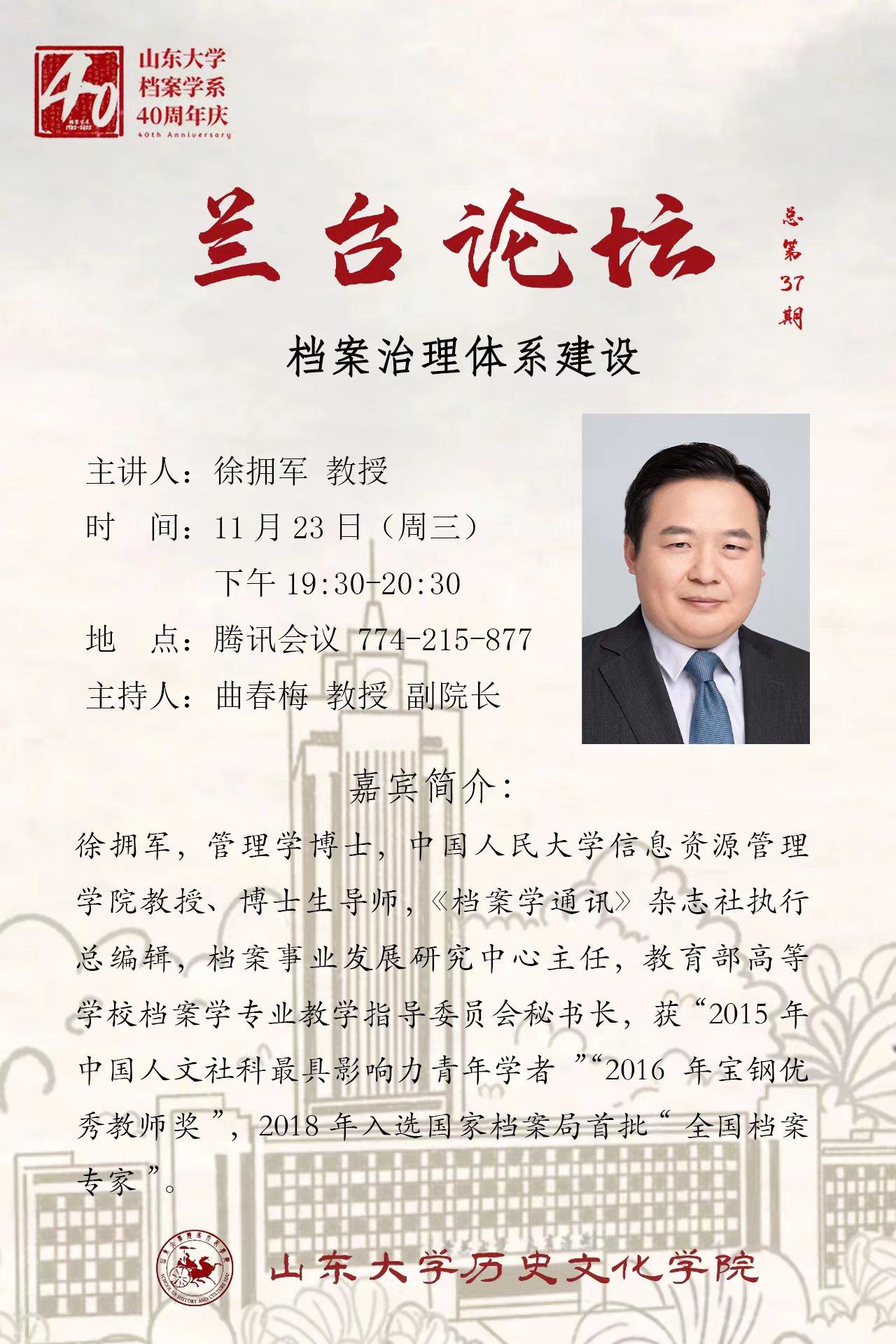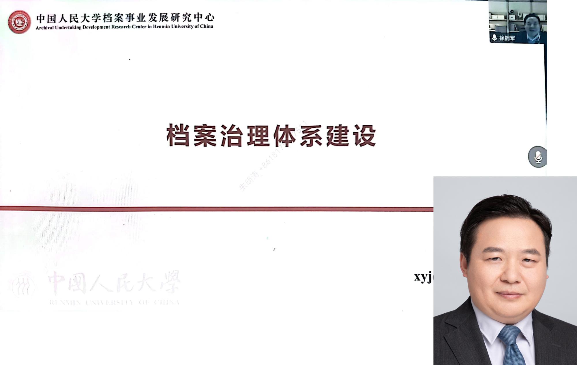 2022年11月23日晚,中国人民大学信息资源管理学院教授、《档案学通讯》杂志社执行总编辑、中国人民大学档案事业发展研究中心主任徐拥军教授应邀为我院师生作题为“档案治理体系建设”的学术报告(线上)。此次报告是兰台论坛第37期,同时也是太阳成tyc122cc集团档案学系40周年庆(1982-2022)系列活动之一。报告由太阳成tyc122cc集团历史文化学院副院长曲春梅教授主持,档案学系师生60余人参加了此次报告会。