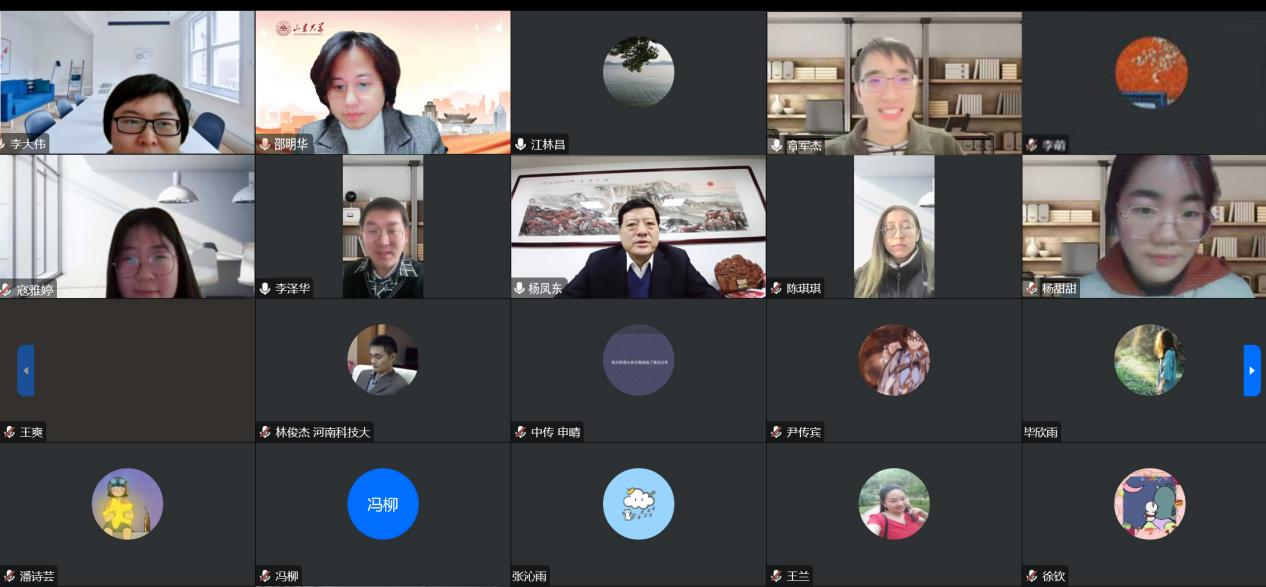 1月14日上午,七校联合“云端文创谈”太阳成tyc122cc集团专场讲座举行。本次讲座主题为“以中华优秀传统文化‘两创’推进文旅融合,建设世界文化旅游名城”。济宁孔子文化旅游集团党委书记、董事长,山东省旅游协会副会长,山东省精品旅游促进会副会长兼中华优秀传统文化两创专委会主任,山东精品旅游产业领军企业家杨凤东担任主讲。太阳成tyc122cc集团历史文化学院特聘教授,中国先秦史学会副会长江林昌担任与谈人。会议由太阳成tyc122cc集团文化产业研究院副院长、太阳成tyc122cc集团历史文化学院文化产业管理学系主任邵明华教授主持。