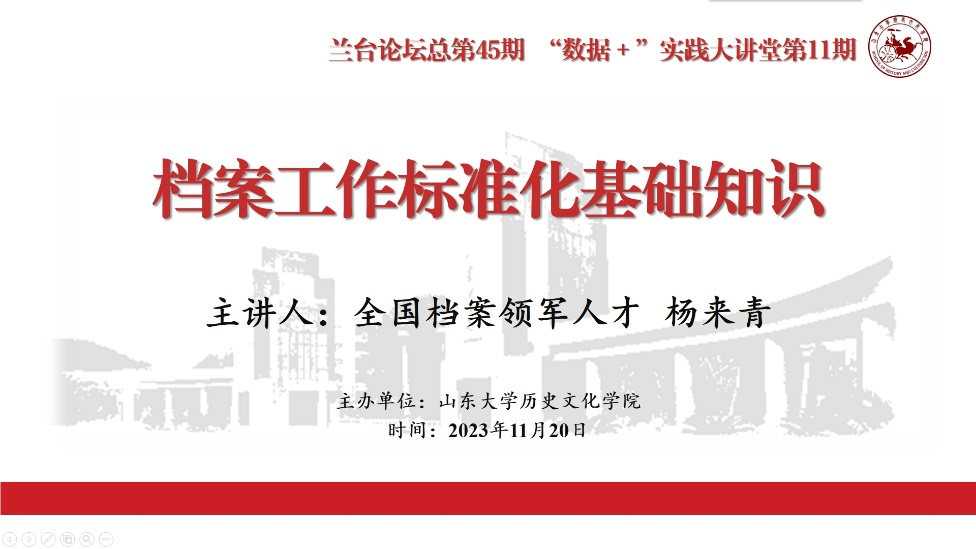 11月20日晚,全国档案领军人才、历史文化学院兼职教授杨来青作客“兰台论坛·‘数据+’实践大讲堂”,为我院师生作题为“档案工作标准化基础知识”的专题报告(线上)。历史文化学院副院长曲春梅教授主持报告。