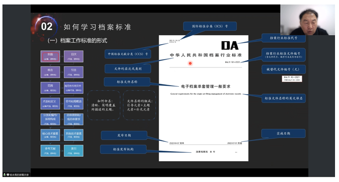 杨来青教授以提高档案专业学生标准化素养为主线,从标准基础知识、如何学习档案标准、档案标准体系建设三个维度出发,结合具体实例深入浅出地讲解了国家对标准化工作的基本要求、标准是什么、标准化文件的类别、标准化文件的结构与要素、档案行业标准化工作现状、如何学习和理解档案标准、如何构建档案标准文件体系等基础知识和基本技能,希望同学们重视标准化素养的提升,具备知标准、学标准、懂标准、用标准的能力,掌握“整体把握+具体吃透+有效实施”标准应用方法,在档案工作中更好地发挥标准化的作用。