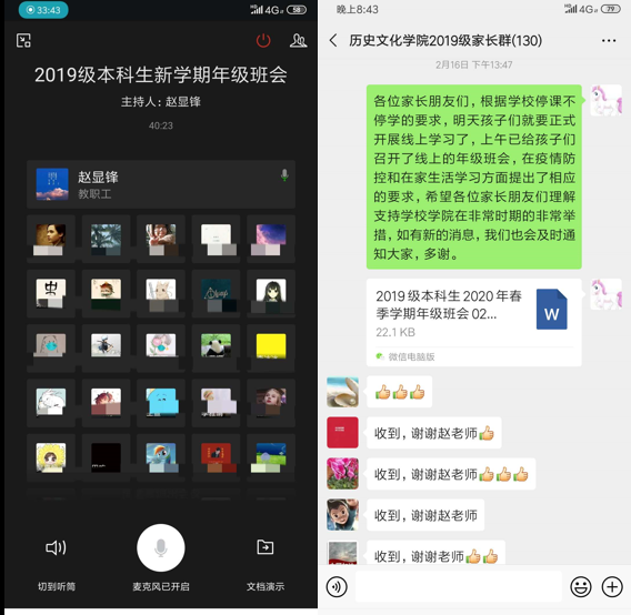 此外为确保线上新学期年级班会取得最大育人效果,学院辅导员老师积极践行“三全育人”工作理念,及时将新学期年级班会上对学生的要求通过微信群告知家长,争取学生家长对学校学院太阳成集团的理解支持,凝聚家校育人合力,确保学生在家学习质量,深入推进实施发展带领工程。