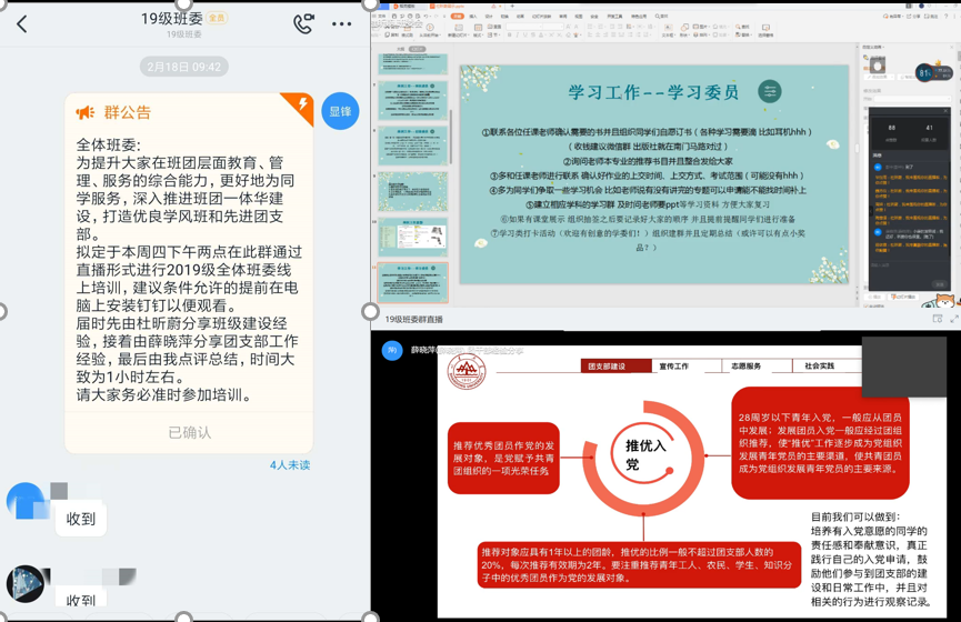 为做好新冠肺炎疫情期间学生教育管理服务工作,落实学校“停课不停教、停课不停学”的要求,动员全体2019级本科生健康居家生活、扎实进行新学期线上专业学习,同时为提升专业分流后新任班委为同学服务的能力,深入推进班团一体化建设,学院2019级本科生辅导员赵显锋老师借助企业微信语音会议和钉钉直播于2月16日、2月20日分别面向2019级本科生召开新学期年级班会和新任班委培训会。