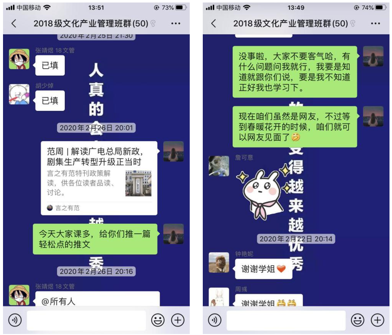 线上助学,互促互进。来自学院各个专业的同学在担任线上助教的过程中,纷纷表示学院开展的线上助教活动既是协助老师教学,也是帮助同学融入线上课堂,更是自身学习和提升的宝贵机会。2016级文化产业管理专业的殷文倩、高洋和李昕认为协助老师调试设备,与学弟学妹们一起讨论问题、交流学习是一件很开心的事情。