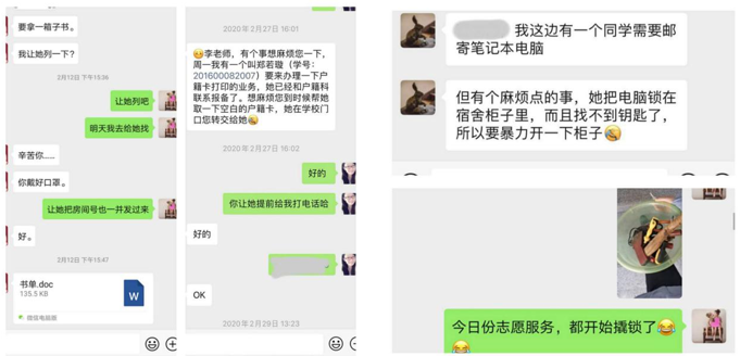辅导员们首先联系了学校宿管中心申请进入学生宿舍“上门取件”,宿管中心老师们给予大力支持,安排已经封闭的楼宇宿管阿姨帮助辅导员进入宿舍。一名毕业班学生所需论文参考书有20多本,宿管阿姨和辅导员一起帮忙寻找,期间和学生多次电话确认,半个多小时终于把学生所列的书目全部找齐,顺利把两箱书籍全部寄出。