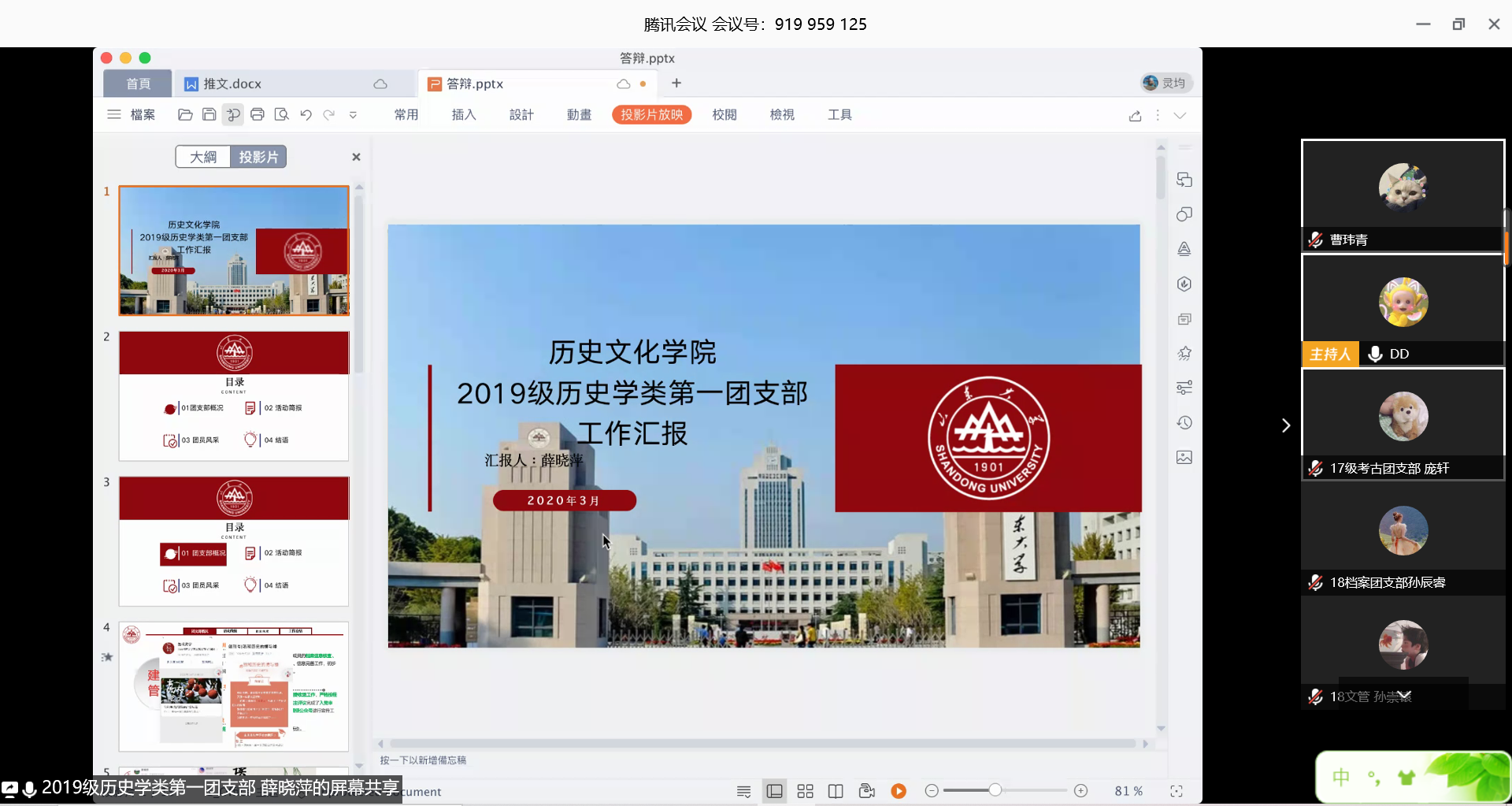 答辩会按照线上抽签顺序依次进行线上答辩。各支部负责人通过幻灯片简要介绍了了团支部在组织建设、思想引领、团员教育、氛围营造以及特色活动等方面取得的成绩,全面展示了团支部的风采。