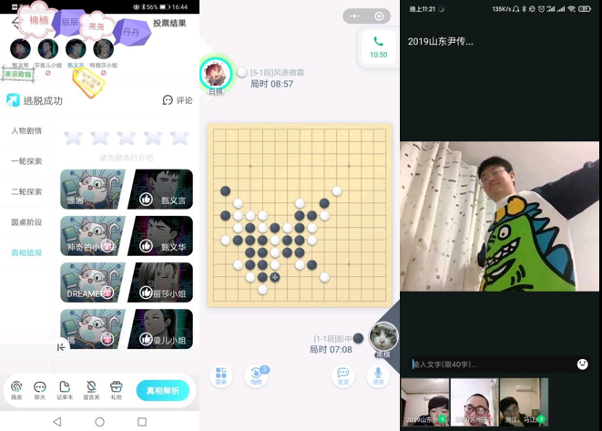 云上互动多样,娱乐学习并举。阔别重“逢”后,有的宿舍进行了剧本推理、棋盘竞技、你比我猜等线上趣味性活动,不少宿舍还沟通交流了居家专业学习问题,在轻松活泼的氛围下,互帮互助、共同进步。7#222宿舍四个人聊了居家学习生活情况后,玩了剧本杀、谁是卧底,室友们在开心玩耍中增进了友谊、切身感受到了来自宿舍的温暖和快乐。7#1604宿舍在云见面中相约了第一届充满欢声笑语的宿舍线上五子棋大赛。7#1611宿舍则“直接开视频聊了聊最近读的书,谈了一下上的课程。因为平常学习有什么感触缺乏分享渠道,能跟室友畅聊着实开心。我们学历史的还是多和同学交流为好,毕竟读历史书不是做数学题,凡事总有多种理解。”9#129宿舍“在大家互相问候了学习生活状况、分享了宅家生活快乐与烦恼之后,一起讨论了如何高效学习,并决定互相监督,过一个充实而有意义的学期。”