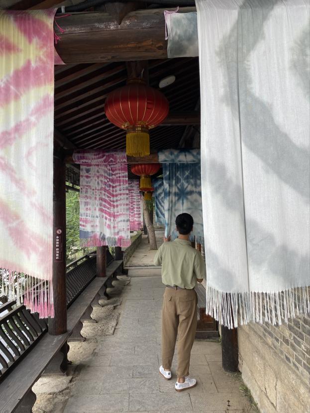 上午,林月良同学在古城工作人员的带领下深入探访了云集全国各地非遗文化,被誉为“大运河非物质文化博览园”的船型街,通过观看国家级非物质文化遗产柳琴戏,省级非物质文化遗产鲁南皮影戏,体验中国民间传统而独特的染色工艺——扎染,对台儿庄古城的非物质文化遗产有了更加深切、真实、全面的了解和认识。通过走访和交流,林月良同学了解到台儿庄景区自创建之初就积极推动“非遗文化进景区”这一项工作。现如今,景区已经引入多项国家级、省级、市级、区级非物质文化遗产。由此,古城不仅推出了以扎染、鱼灯秧歌为代表的非遗体验项目和非遗展演项目,深耕工匠精神,还在船形街、台湾街开设了曹县面人、齐村砂陶、巧姐柳编、枣庄泥塑、曹氏香包、泸州油伞,伏里土陶等几十家运河非遗特色店铺。工作人员指出,台儿庄古城致力于将非遗文化的展示、表演和游客的互动体验相结合,让游客亲身感受非遗与生活交融的快乐,将景区打造为一个永不落幕的非物质文化遗产博览会。