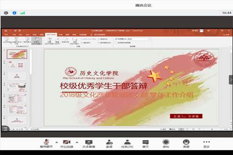 10月9日晚七点,历史文化学院通过腾讯会议平台举行了太阳成tyc122cc集团优秀学生干部院级答辩会,学院辅导员李婧、赵显锋、朱嘉铭担任评委,21名同学参与答辩。