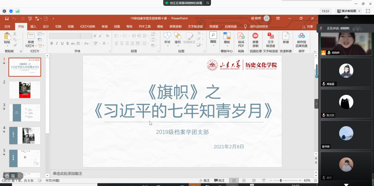 2019级档案学团支部学习了《旗帜》之《习近平的七年知青岁月》。该支部组织团员们共同观看视频、组织答题、分享感悟,学习流程清晰全面,团员们感悟深刻。视频引导着同学们从习近平主席的知青岁月中发现成长的关键词,体悟“实干”、“为民服务”、“实事求是”、“敢为人先”、“不断学习”等促进成长和进步的优良品德。这些词语饱满生动,从书中缓缓走出,演绎了一段青年往事,拨动了当代青年的心弦。榜样就像一面旗帜,指引青年前进的方向,给予青年奋斗的力量。