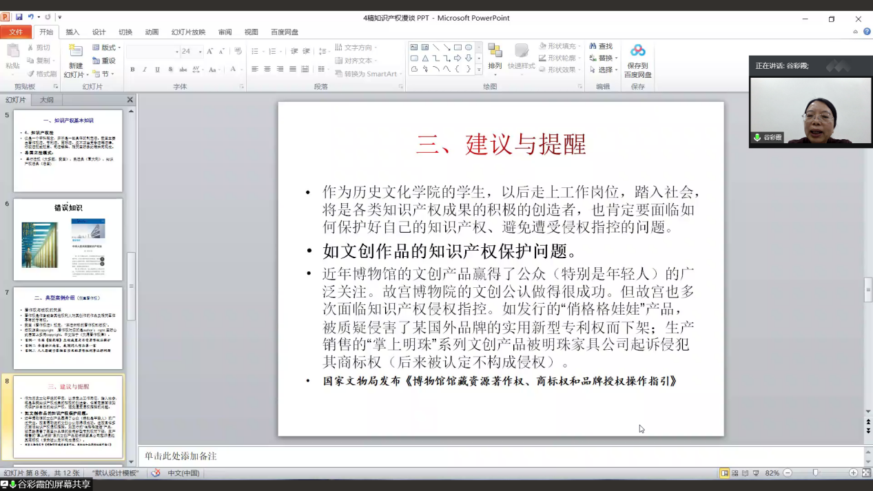 本次讲座以“知识产权保护漫谈”为主题。谷彩霞庭长以民法典等时事热点为切入点,结合习近平总书记在《求是》上发表的文章,为大家介绍知识产权保护的重要性及重大意义。她深入浅出地向大家介绍了知识产权保护的基本知识,结合现实生活中的例子,纠正了大众对知识产权保护的错误认知。她联系近年热点事件,例古籍《镜花缘》点校成果是否受保护等多类型的典型案例向大家进一步讲解了著作权知识的保护。她强调,我国通过民事、行政、刑事三管齐下,对知识产权进行立体的、全面的保护。她指出,高校学生未来无论是在实习还是工作岗位上,都将会与知识产权保护息息相关,要具有法律意识,要及时对自己创作的作品进行登记,使用他人作品要谨防被诉侵权的风险,及时进行商标注册,申请注册商标要有显著性和独创性,明确约定合作研发或创作成果的权利归属等。在最后一部分,同学们进行了积极踊跃的提问,谷彩霞对相关问题进行了深入的解答和交流,大家受益匪浅