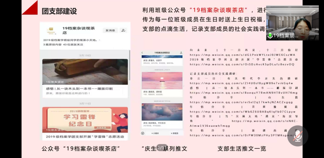 各支部负责人按照会前抽签顺序,通过PPT展示,对过去一年中团支部的整体状况进行总结汇报。各支部围绕团支部概况、工作开展、成员风采等多个部分,对其丰富多彩的支部活动、支部成员的多元发展等方面进行详细介绍,充分展示了支部发展的的良好状况与团员青年的精神风貌。