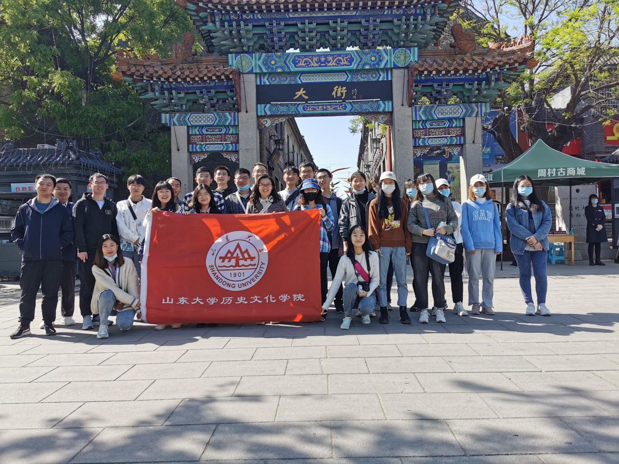 18日,师生一行首先来到淄博市周村区参观周村古商城。古城内古迹众多、店铺林立、街区纵横,建筑风格多样,至今仍在发挥商业功能。在栾福德、叶宇涵、王叶玲、钟艳雯同学的介绍中,同学们对鲁商文化、明清时期山东发达的工商业有了更加深刻地理解。