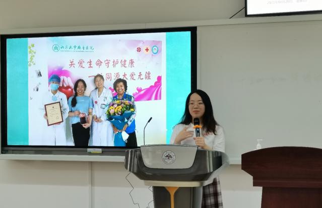 王一帆对造血干细胞捐献进行了宣传讲解。他详细阐述了白血病的起因、治疗手段及现状,指出造血干细胞移植是白血病很重要的治疗手段。同时通过播放宣传片,详细完整地介绍了造血干细胞捐献过程,使大家对捐献流程有了全面了解,也加深了同学们对造血干细胞捐献手术的正确认知。他鼓励同学们在身体条件允许的情况下,可以积极投入到捐献队伍中去,传递生命火种,点燃爱心希望。