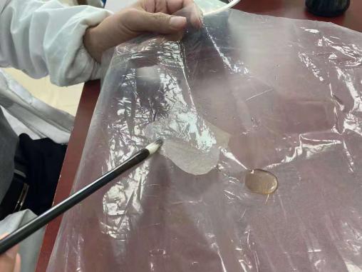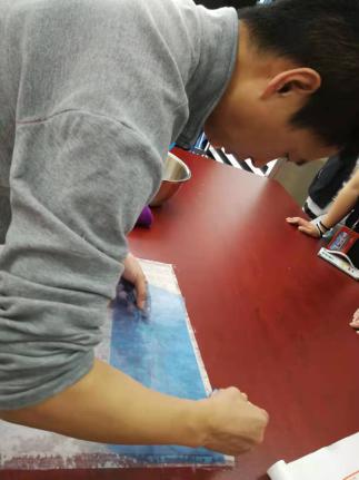 演示环节开始,张同彬老师首先为同学们演示了字画托裱的具体工作。字画托裱最开始需要用喷壶在合适的高度均匀地喷少量水,将字画轻微润湿后展平。接着使用蘸稀浆水后的羊毛刷将字画一侧固定在桌面上,并采用“米”字的手法将纸张在裱画台上刷平。然后取一张宣纸,卷成筒状,将纸的一侧固定在字画上方,再用左手将宣纸舒展开,同时右手持鬃刷上下来回刷动,迅速将纸平铺在字画上方。在确保没有褶皱后,需要将纸的四周刷上浆糊,需要注意不要刷到画芯上。之后取一小块白纸放在边缘,作为预留起口。最后将刷完浆糊的纸从桌面上小心揭下,贴到挣墙上,并拿鬃刷轻轻敲打纸张边缘,将其固定在墙上。演示结束以后,同学们在老师们的指导下亲自动手体验字画托裱与上墙的过程。