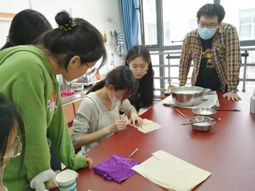 李璇老师则向同学们演示了浆糊的制作与古籍的修复过程。她先向同学们介绍了淀粉的制作过程,然后详细讲解了浆糊的制作过程。浆糊制作最开始需要往小麦淀粉中倒入一点清水,然后慢慢搅开,确保淀粉不会结块;加入少量沸水,以卸去淀粉的韧劲;随即加入大量沸水冲泡,并迅速沿一个方向搅拌,直到浆糊微微发黄且略微拉丝。整个搅拌过程大概需要十分钟。搅拌结束以后,需要将浆糊放置冷却至适宜温度,再倒入适量清水备用。