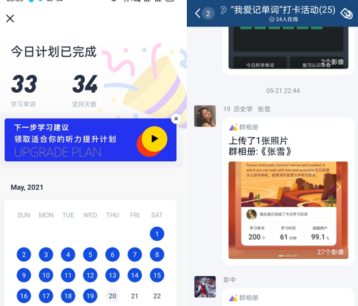 本次活动调动班级全员积极参与,班级同学们至少选择两者之一,立下并签署了“诚信状”,同时通过线上群聊的方式监督互动,同学们选择进入打卡群聊后建立专属相册,活动期间,大家表现积极,每日坚持打卡,最终所有同学都顺利完成任务。单词打卡活动结束后,王昕欣同学对此表示:“诚信状打卡活动刚好在六级考试之前,通过21天习惯法帮助我及时养成了背单词的好习惯,让我在六级考场上感受到了明显进步。”陈月婷同学也说道:“每日坚持单词打卡,让我能够坚持背诵英语六级单词,为六级考试打下基础。非常感谢这次活动。” 对于跑步打卡活动,参与的徐钦同学说:“在之前也有每天跑步的计划,但可能因为各种原因,断断续续没有坚持下来。通过这次跑步诚信状活动,帮助自己养成了每天坚持跑步的习惯,也为之后的锻炼计划制订了目标和计划。”