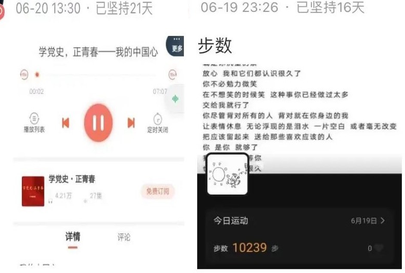 学习板块同学们参与情况良好,“天天记单词”活动,背诵内容多为四六级单词,通过21天习惯的养成,能够帮助同学们扩大词汇量,提高英语学习的能力,在期末考试中更好地发挥。“我爱记笔记”活动,范围囊括了从上课笔记到复习笔记再到心情笔记的诸多类别,同学们用手写或电子文档的方式打卡,记录下学习生活的点滴,这是学习成长之路最好的见证。“每天学党史”活动,百年砥砺峥嵘路,百年光辉党史铭。2021年在全党开展党史学习教育,同学们通过每天的党史学习打卡,深入贯彻习近平总书记“学史明理、学史增信、学史崇德、学史力行”的重要思想,通过党史阅读感受中国共产党百年蓬勃发展历程。