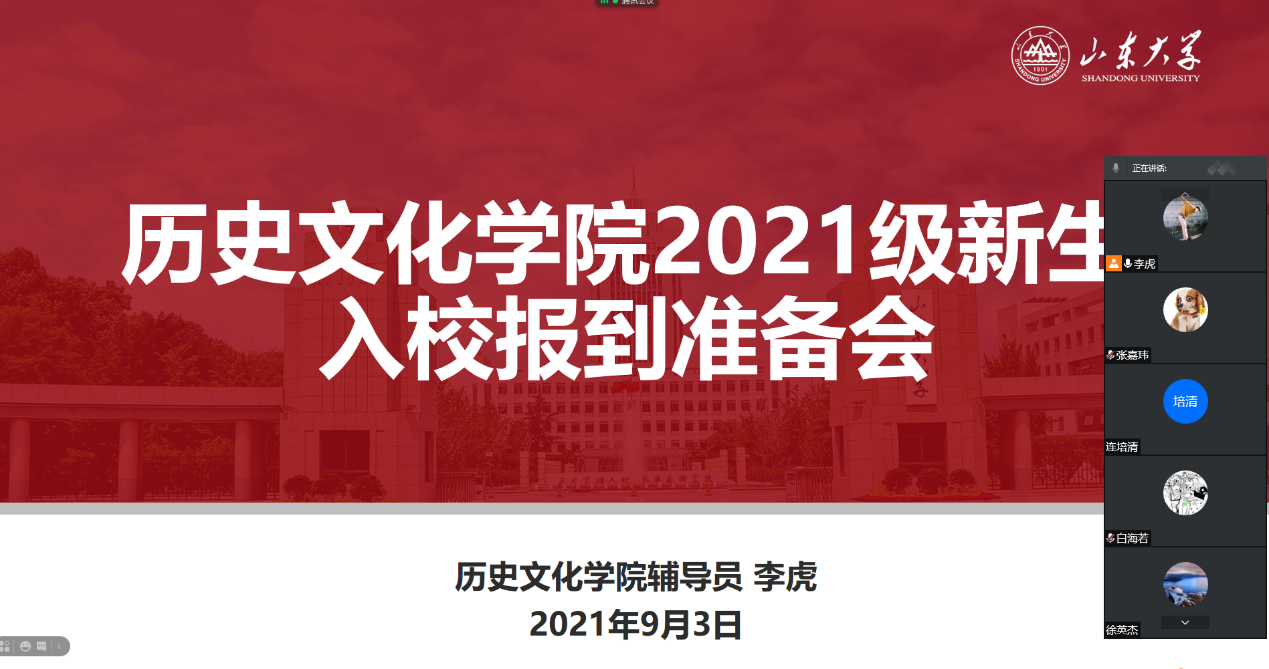 为进一步做好2021级新生入校报到工作,确保学院迎新工作平稳有序、圆满完成,助力新生尽快融入新环境、适应新生活,按照学校迎新工作部署,9月4日晚,历史文化学院面向21级全体新生通过腾讯会议线上召开了入校准备“云班会”。