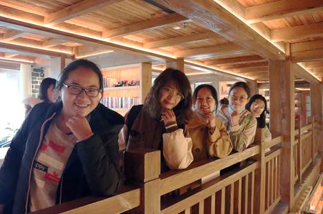 首先参观的是在山下湖边依次摆放的“红颜容木桶民宿”,通过红酒木桶的创造性设计,将其设计为实用精巧的木屋,坐可看山色湖景,躺可观星赏月,夜晚灯光加持,与湖面交映成趣,在导游的介绍下,同学们了解到木桶民宿主打浪漫的爱巢文化,定位明确,极具特色。接下来是与山色植被深度融合的“阅木山居”,与大自然亲密接触,整个空间实木打造,配套设施齐全,可满足家庭居住需求,致力于让入住者享受彼此相处的每一寸时光,多处细节让参观的同学惊叹细致到位。同样别具风格的是与泉城书房合作的书吧以及隐藏在书吧里的“梦枕书香书吧”民宿,一层、二层是阅读区和商务区,三层则是隐藏在书架里的房间,将木香、书香与梦香融为一体,设计浪漫前卫,参观同学纷纷拍照打卡留念。