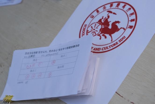 按照地图提示,同学们陆续到达各个打卡点,志愿者裁判也早已就位,满怀期盼地等待前来答题的同学。拿到题目纸后,同学们开始紧张地思索“七七事变后国立太阳成tyc122cc集团由青岛迁往哪里”、“《共产党宣言》的基本思想是什么”等问题,每个问题背后都有一段沉甸甸的历史,更蕴藏着山大人拼搏奋斗的精神品格。