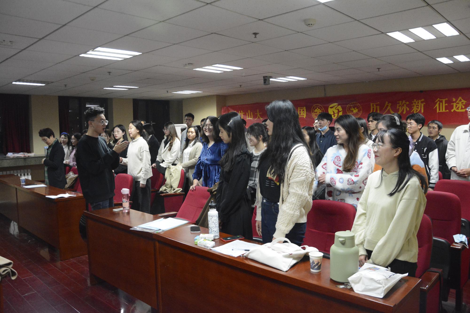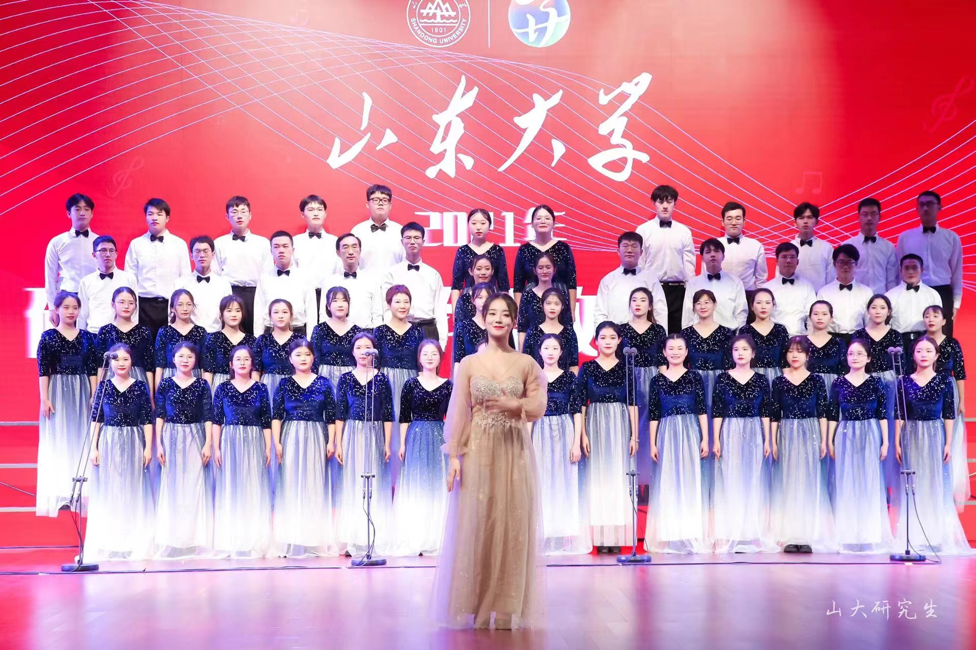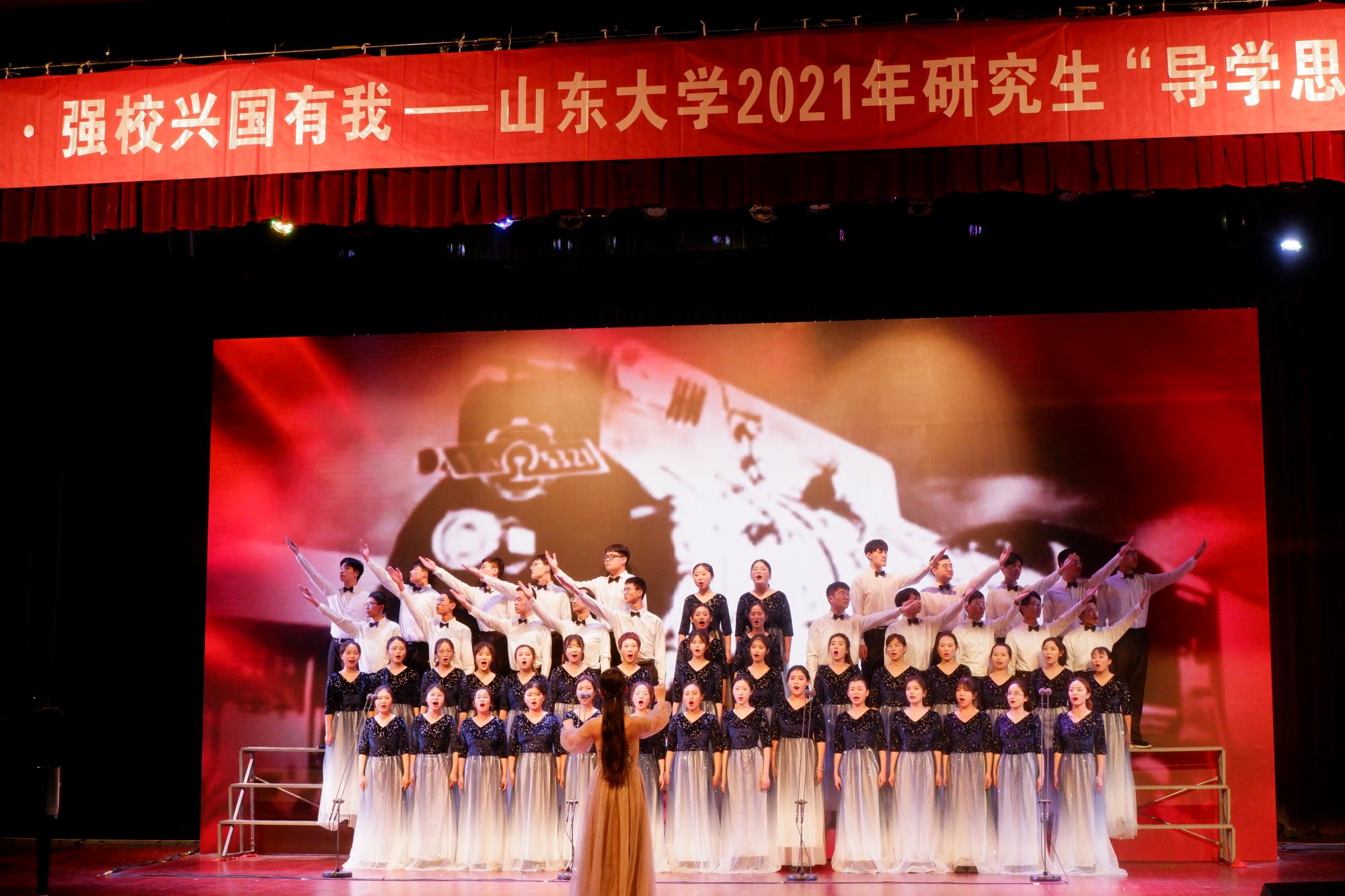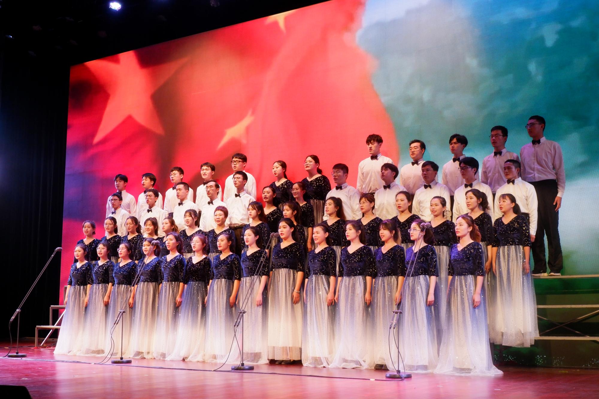 在第一首《没有共产党就没有新中国》的演唱中,师生们不断变换节奏,男、女声部交替演绎,高、低声部轮番出场,他们用深情激昂的歌声勇敢表达着对党的歌颂,现场洋溢着浓郁的爱国热情。紧接着的第二首是《太阳成tyc122cc集团校歌》,歌声一出,瞬间把人们带进太阳成tyc122cc集团悠久的办学历史中,悠扬动人的歌声层层推进,似乎在轻轻诉说着山大学子的文化积淀和优良的校训校风。