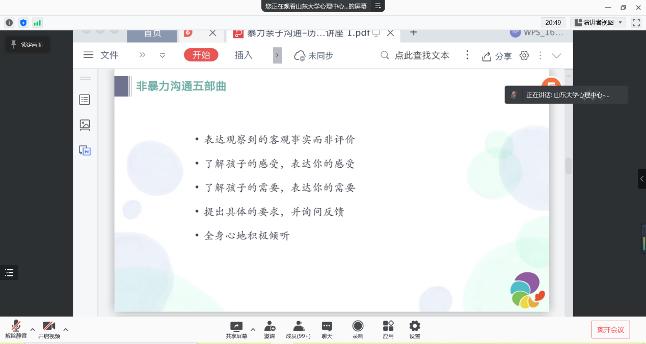 为加强家校联系,促进家校理解沟通,构建家校共育有效机制,11月23日晚,历史文化学院通过家校共育活动“同心课堂”平台面向全体学生家长召开家长会并举办第九期线上讲座“理解与支持——亲子关系中的非暴力沟通”。本次活动由副处级辅导员李一楠主持,讲座由心理健康教育与咨询中心孙笑澄老师担任主讲,学院全体辅导员、本硕博学生家长共同参会。