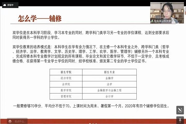 同时,线上宣讲活动也有序展开。组员们结合之前问卷内容,录制宣传视频在学校播放,同时利用腾讯会议等线上平台开展实时宣讲。宣讲内容切合高三学生的现实需求,贴近大学真实学习生活,赢得回访母校师生的一致好评。