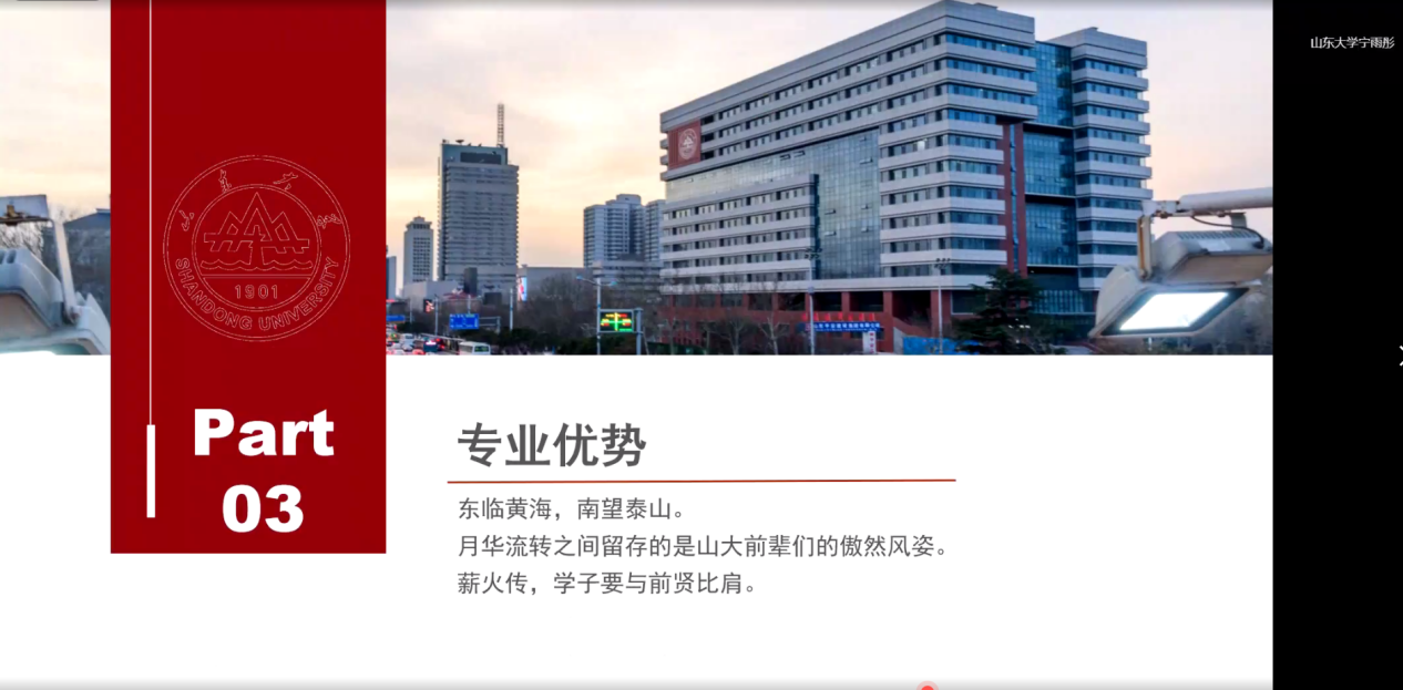 1月23日起,宣讲活动在各校陆续开展。考虑到陕西省疫情防控形势与要求,本次宣讲全程采用线上形式。为了做好活动预热,组员们提供了山大宣传视频在各中学进行播放,并利用腾讯会议等线上平台开展直播讲解。整体宣讲内容围绕“录取分数”“专业优势”“校园生活”三大模块展开,同时加入组员们的学习生活掠影与真实感受,符合高中学生现实需求,收到众多学子好评。