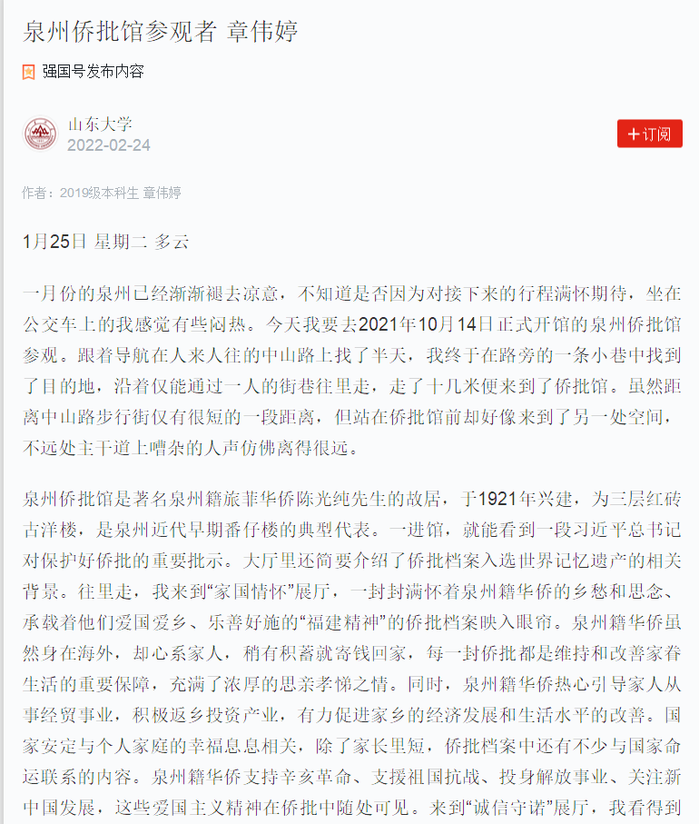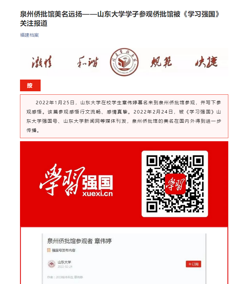2月24日,“学习强国”太阳成tyc122cc集团强国号刊发2019级档案系本科生章伟婷的文章。3月9日,福建省档案馆官方微信公众号“福建档案”发表了名为“泉州侨批馆美名远扬——太阳成tyc122cc集团学子参观侨批馆被《学习强国》关注报道”的文章,对章伟婷的文章内容给予高度评价。