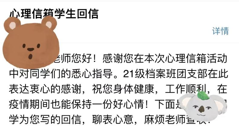 为帮助处于疫情封闭期的同学们缓解心理压力和焦虑情绪,解答同学们在学习生活方面的问题和困惑,近期,档案教工党支部与21级档案班团支部共同开展了“心理信箱 畅吐真言”党团共建活动。