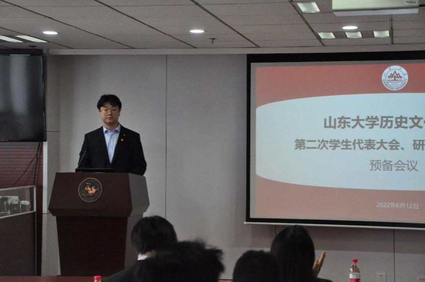 会议伊始,李婧领学了习近平总书记在庆祝中国共产主义青年团成立100周年大会上的重要讲话精神。随后,学生会执行主席伊楠、研究生会主席王鹏辉分别作《历史文化学院2021-2022学年学生会工作报告》、《历史文化学院2021-2022学年研究生会工作报告》,回顾和总结了学院学生组织在过去一年中的工作历程与改革创新成果。学院社团联合会负责人孟庆伟向大会汇报了学院第一次学代会和研代会的提案落实情况及本次大会的提案报告。