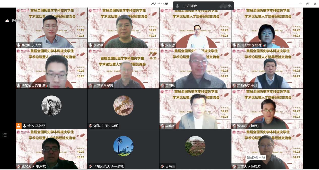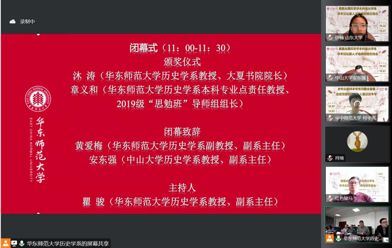 为推动拔尖计划2.0基地建设,加强兄弟院系间相互交流与学习,促进历史学本科拔尖人才成长发展,2022年10月22日至23日,华东师范大学主办首届“全国历史学本科拔尖学生学术论坛暨人才培养经验交流会”。历史文化学院孔勇老师与2019级本科生伊楠、2020级本科生王若蘅线上参会。