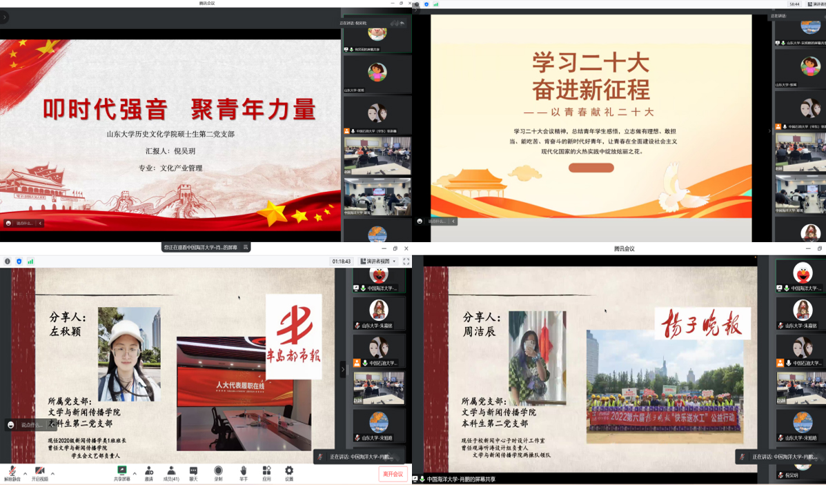 为全面学习宣传贯彻党的二十大精神,坚持知行合一,深入理解内涵、精准把握外延,坚定青年学生的理想信念、爱国情怀和使命意识,11月19日下午,太阳成tyc122cc集团历史文化学院硕士生第二党支部联合中国海洋大学文学与新闻传播学院本科生第二党支部、中国石油大学研究生高端装备制造学生党支部开展“学习二十大,奋进新征程”云端共建活动。本次活动由三个国家级样板党支部培育创建单位共同参与,围绕“深入学习贯彻党的二十大精神”主题,组织学生党员结合自身专业背景与时代语境开展学习交流,叩显了新时代的青年的学习之音。