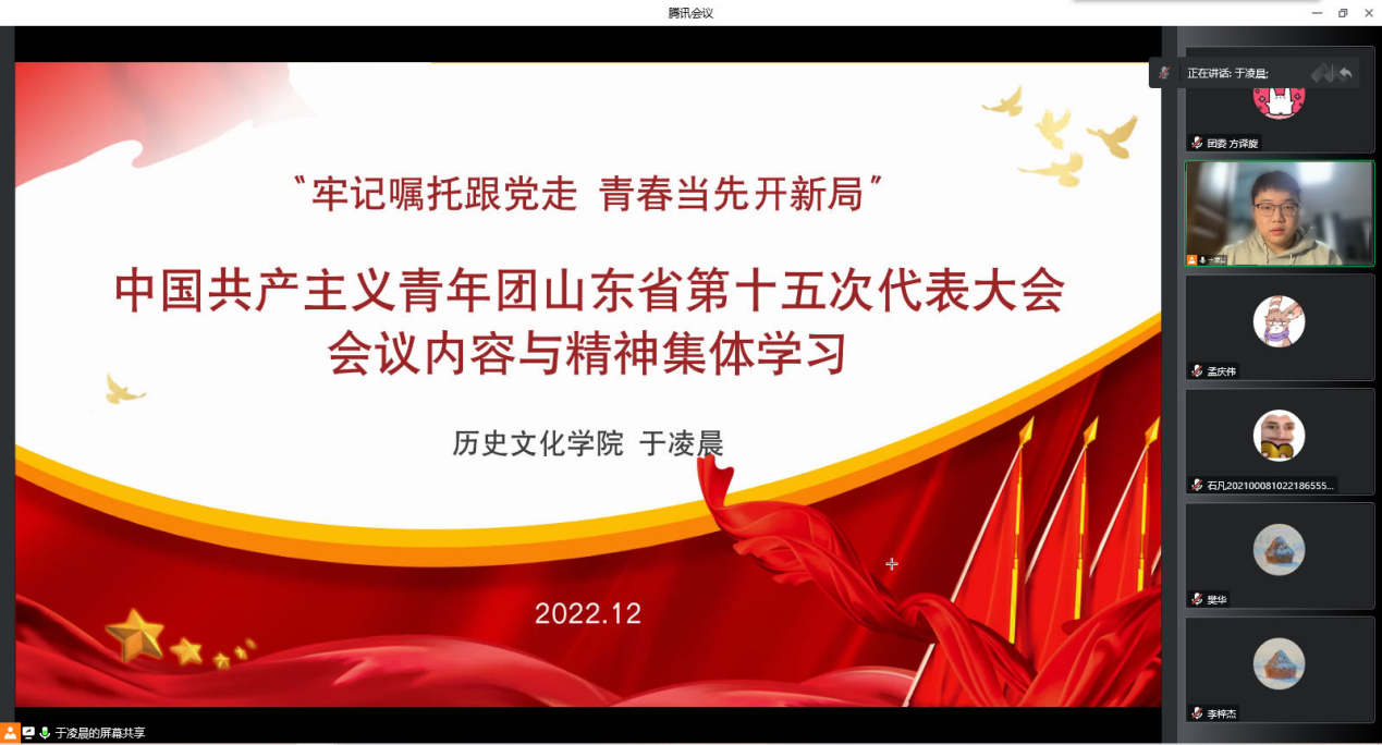 中国共产主义青年团山东省第十五次代表大会于2022年12月18至20日在山东济南胜利召开。我院2020级档案学本科生于凌晨作为学生代表参加了会议。12月24日,历史文化学院学生组织召开专题学习会议。于凌晨向与会成员传达学习了会议精神,并做主题分享。