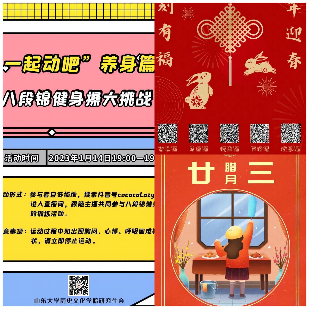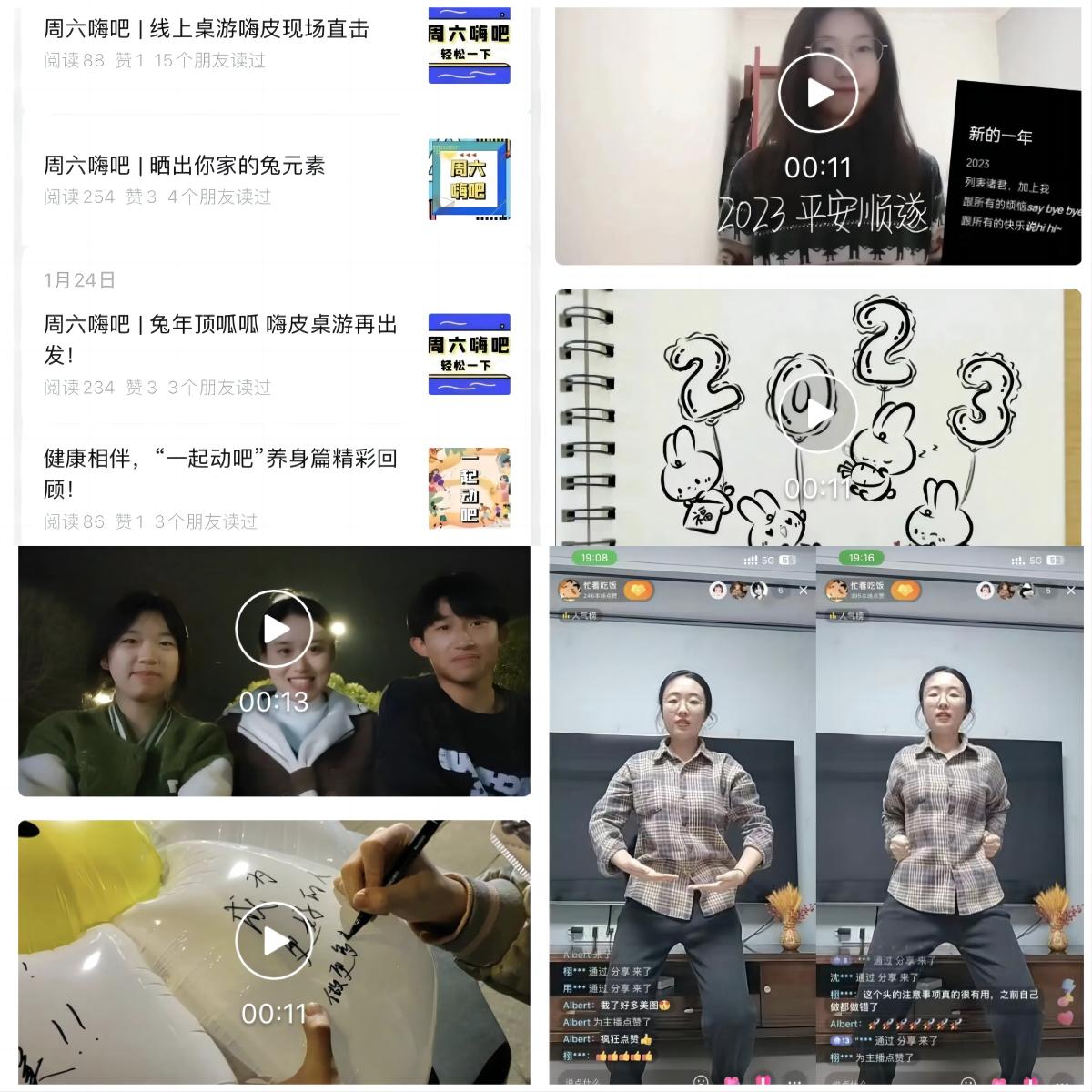 以美化人,以体健人,同步体育美育“双在线”。学院始终把学生的健康安全居于首位,为帮助广大师生强身健体,助益寒假生活,组织开展“一起动吧”养身篇——八段锦健身操大挑战,通过线上直播形式,激发学生的运动热情。组织两期“周六嗨吧”活动,通过“晒出你家的兔元素”“兔年顶呱呱,嗨皮桌游再出发”两项活动,增进学生间的情谊,感受传统节日魅力。开展“卯”足干劲,大展宏图——农历新年集五福活动,为新的一年增添喜气与活力。另外,假期期间学院学生会、研究生会公众号平台连续推出家·春·秋系列、支部风采系列、年俗文化海报等20余篇推文,以图文并茂的方式介绍传统文化,彰显学院潜心育人品牌特色。