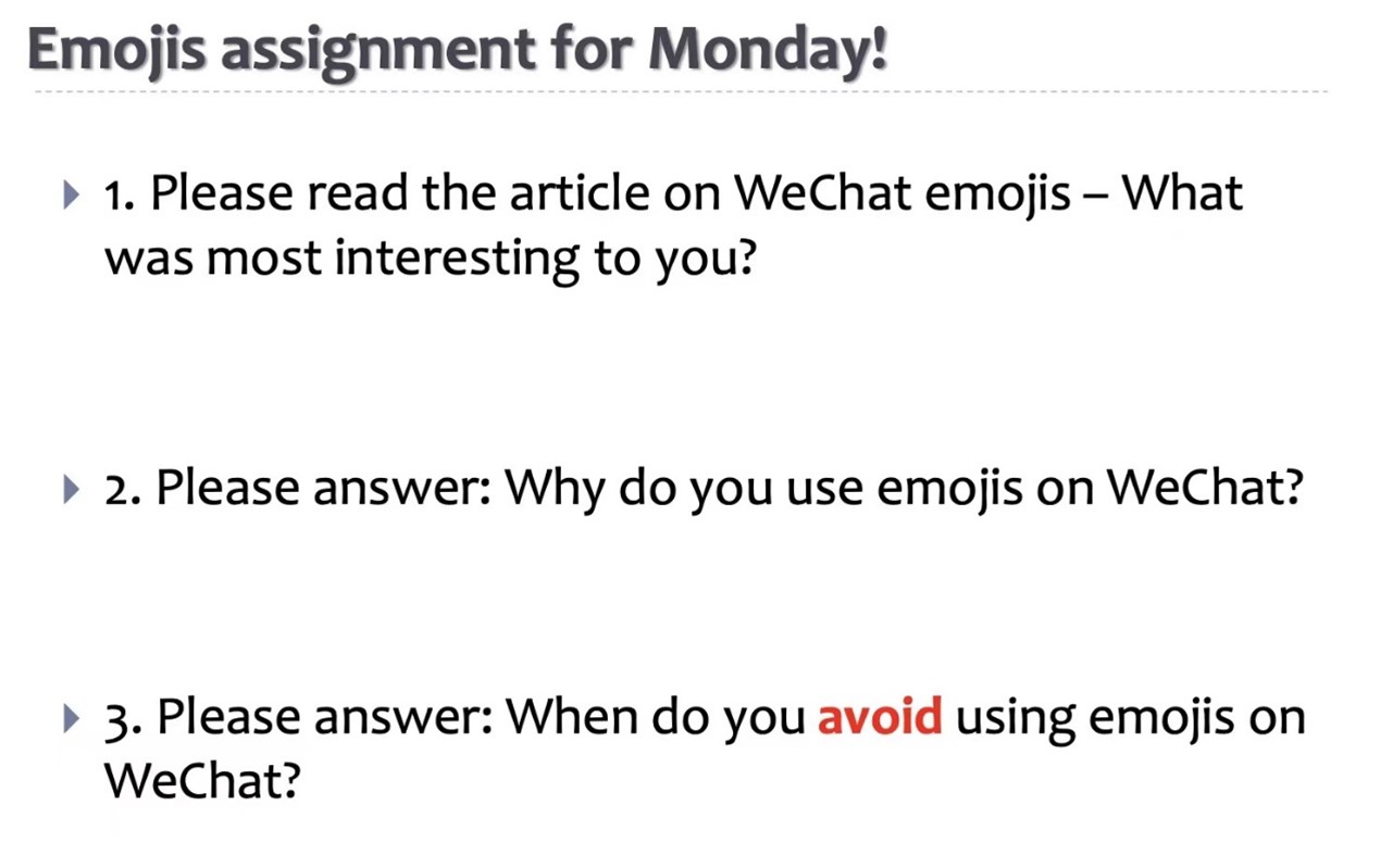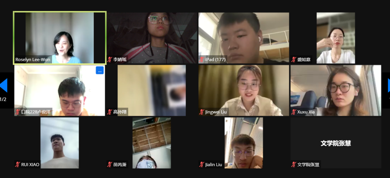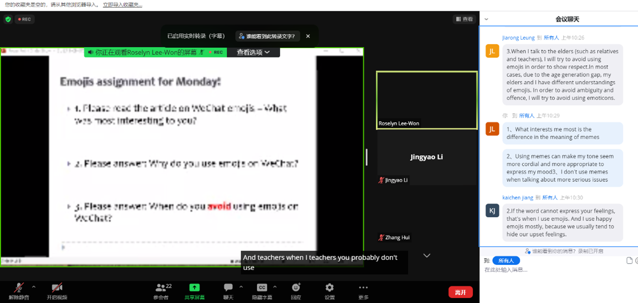 线上zoom教学环境和全英文授课对同学们来说也是进行不小的挑战,同学们不仅要学会使用英文进行交流互动,还要用英文表达出对专业知识见解与看法。Roselyn Lee-Won教授向学生展示了一篇关于表情包的文章,并提出了一些问题。学生们在教授的引导下积极思考,踊跃回答问题。