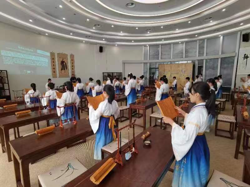 7月18日上午10:00-12:00,志愿者孙凯璇参观济南非遗体验基地,观看青少年身着传统服饰,在至圣先师面前诵读诗书,体验非遗活动。在参观之后,志愿者为前来体验的小朋友们提供帮助,在他们准备染色时在身旁指导。