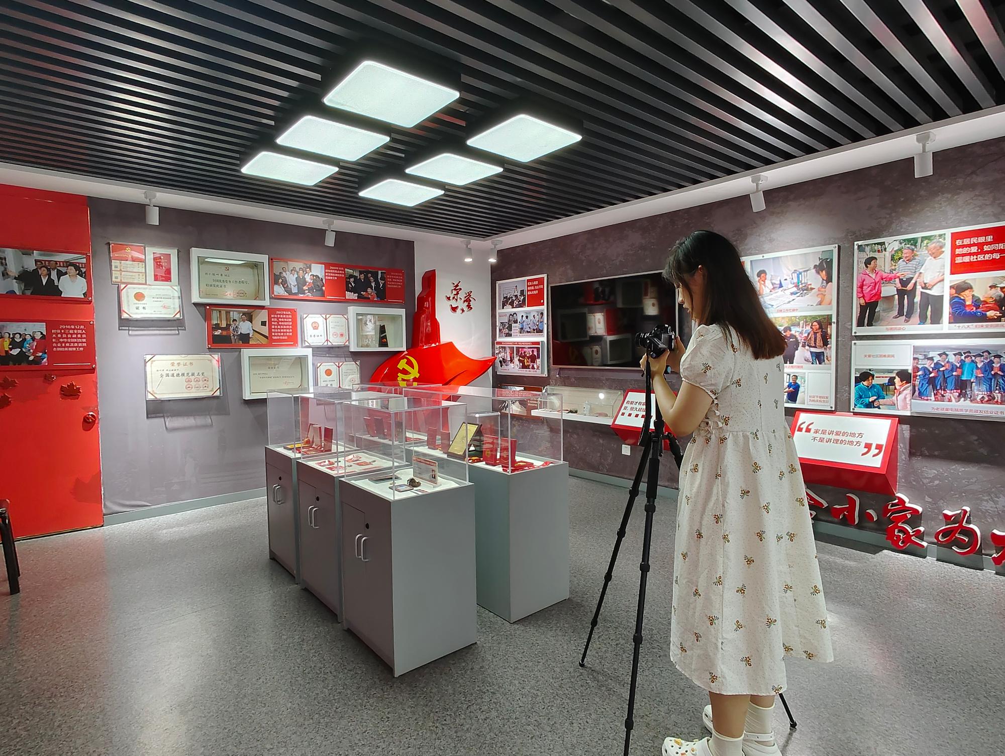 8月25日上午,团队成员前往甸柳第一社区委员会,和社区负责人交流并商议准备工作。随后,团队成员来到社区周边小区,结合先前调研成果取景拍摄。忙碌紧张的小区拍摄完成,社区负责人带领团队来到社区陈叶翠纪念馆,团队在认真学习陈叶翠精神后用相机认真记录纪念馆的文化风貌,为甸柳社区的文化底蕴宣传奠定了更深层的思想基础。