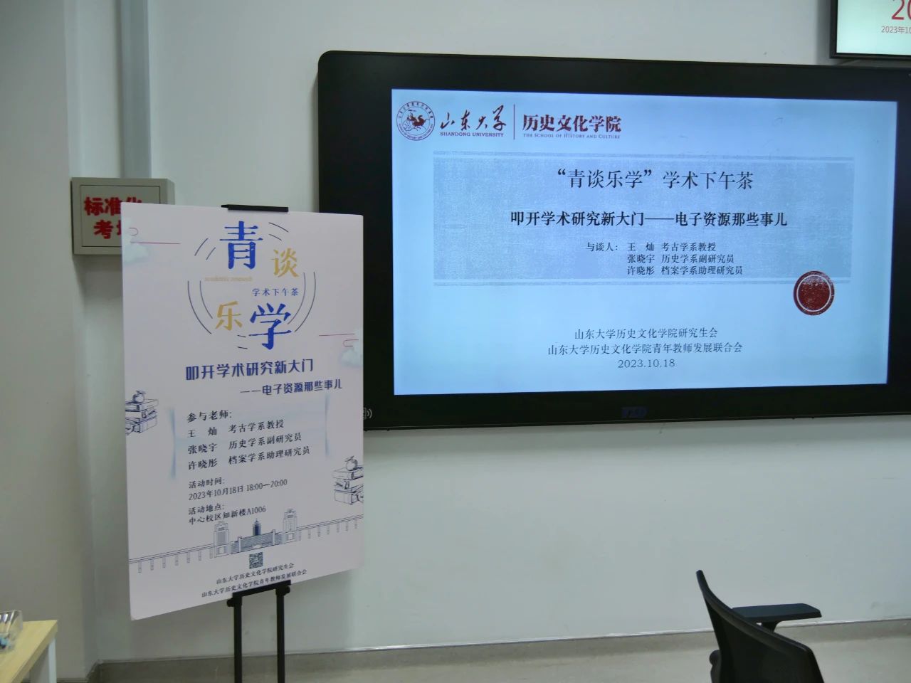 10月18日下午,由历史文化学院研究生会、历史文化学院青年教师发展联合会联合举办的“青谈乐学”学术下午茶活动在信息楼B117举行,活动主题为“电子资源的利用”。本次活动邀请到历史文化学院考古学系教授王灿、历史学系副研究员张晓宇、档案学系助理研究员许晓彤分享科研经验与方法心得,来自不同学院不同年级的60余名本科生、硕博研究生参加了活动。