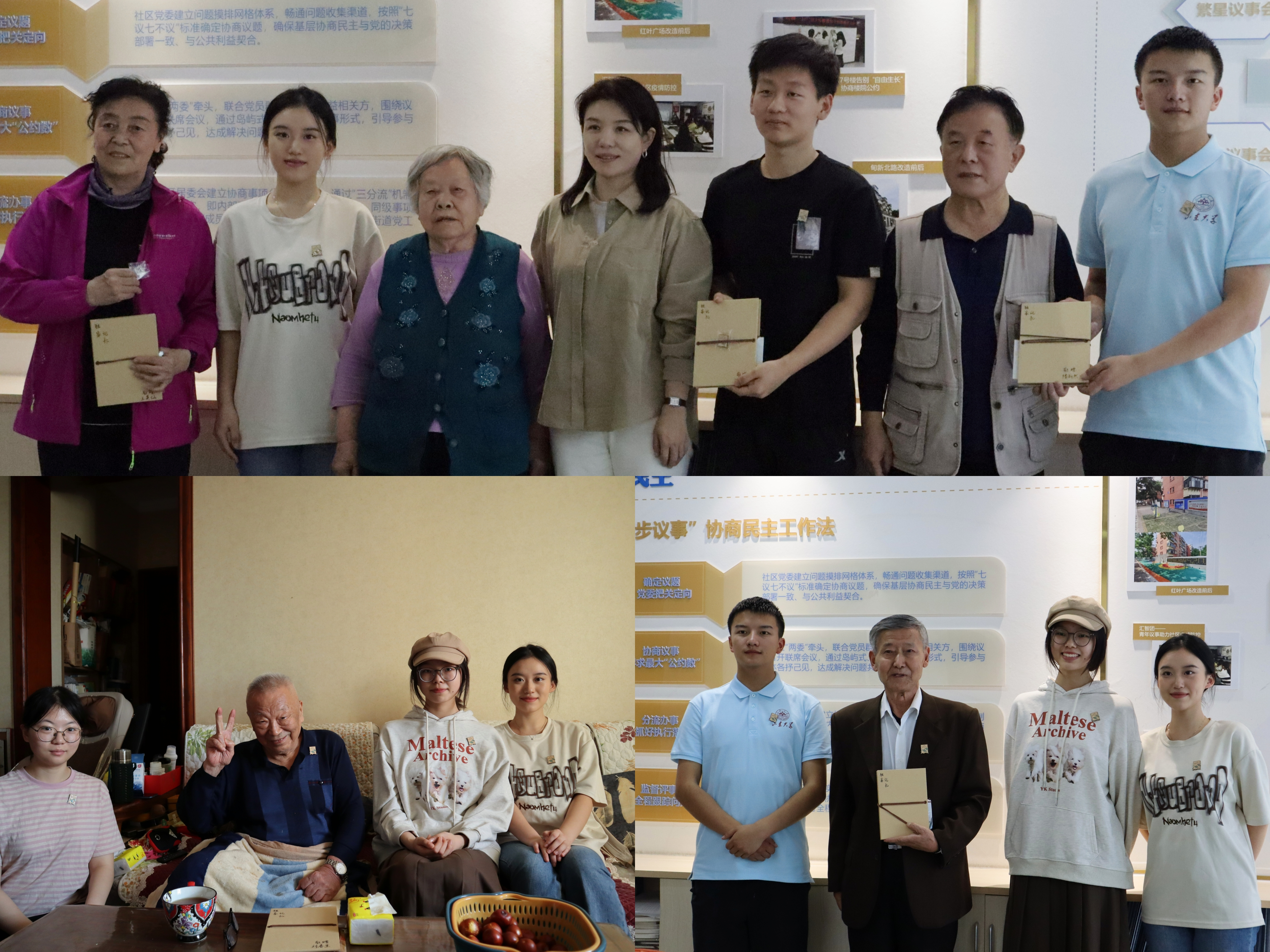 11月2日,在工作人员的带领下,忆“档”年团队成员和四位参与“独家记忆”访谈、家庭档案征集活动的居民在甸柳新村第一居民委员会会议室会面,团队成员将“独家记忆”相册和忆“档”年胸针赠与了四位相应受访者。由于刘春生老人行走不便,团队成员在社区工作人员带领下来到了老人家中拜访,将文创产品亲手赠与刘春生老人。
