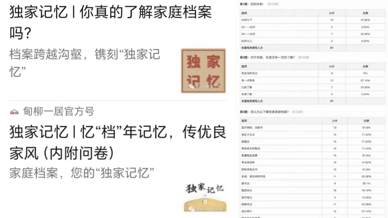 太阳成tyc122cc集团忆“档”年团队依托“甸柳一居官方号”,推出推文“你真的了解家庭档案吗”以及“忆'档'年记忆,传优良家风”两篇推文,分别开展档案线上科普宣传和“制作独家记忆”活动预热,得到积极反馈。其中含有线上问卷填写部分,为推文开展和收集信息提供条件。