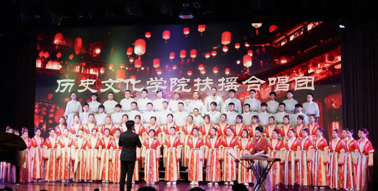 古筝声动,彩缕飘扬,一曲吟唱,忆历史时光。在全场师生的注目下,历史文化学院扶摇合唱团第15顺位登场高歌,师生合力,共同演绎一曲古色古香的动听歌曲。合唱团员皆身着汉服,女生粉妆玉琢,优雅靓丽,男生温文尔雅,清新俊逸,尽显书香之气,宋雅之风。在姜艺同学的古筝伴奏声和李家宁同学的指挥下,女音潺潺如流水,缓缓而起,带领观众走入历史的画卷;男音厚重如青山,游响停云,迎客入古道,为大家点亮盏盏华灯。曲至高处,许晓彤老师的深情朗诵为演出锦上添花。在合唱团员收放自如、宛转悠扬的演唱声中,台下的观众仿佛回到了宋时佳节。一曲唱罢,现场掌声雷动,经久不息,欢呼声不绝于耳。