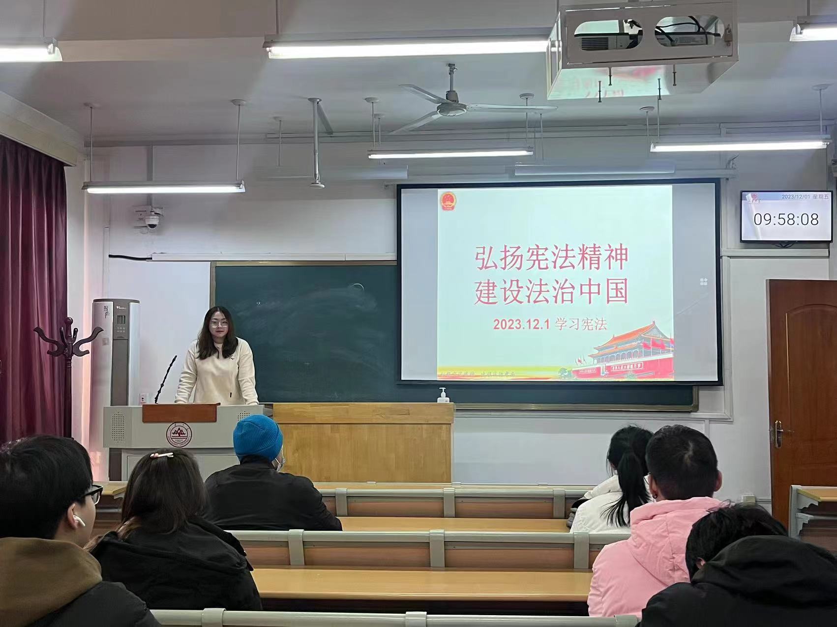 读宪法,激励青年力量。12月,历史文化学院组织2021级、2022级本科生团支部开展课前十分钟“宪法晨读”、“宪法领学”活动。通过选取宪法序言及正文中的部分章节、条款组织各团支部同学进行朗读,诵读宪法,让宪法“声”入心间,将宪法内化于心、外化于行;组织各团支部书记带头领学习近平总书记发表的关于纪念现行宪法公布施行40周年重要署名文章精神,营造宪法宣传教育的浓厚氛围,提升法制宣传教育的感染力和吸引力。
