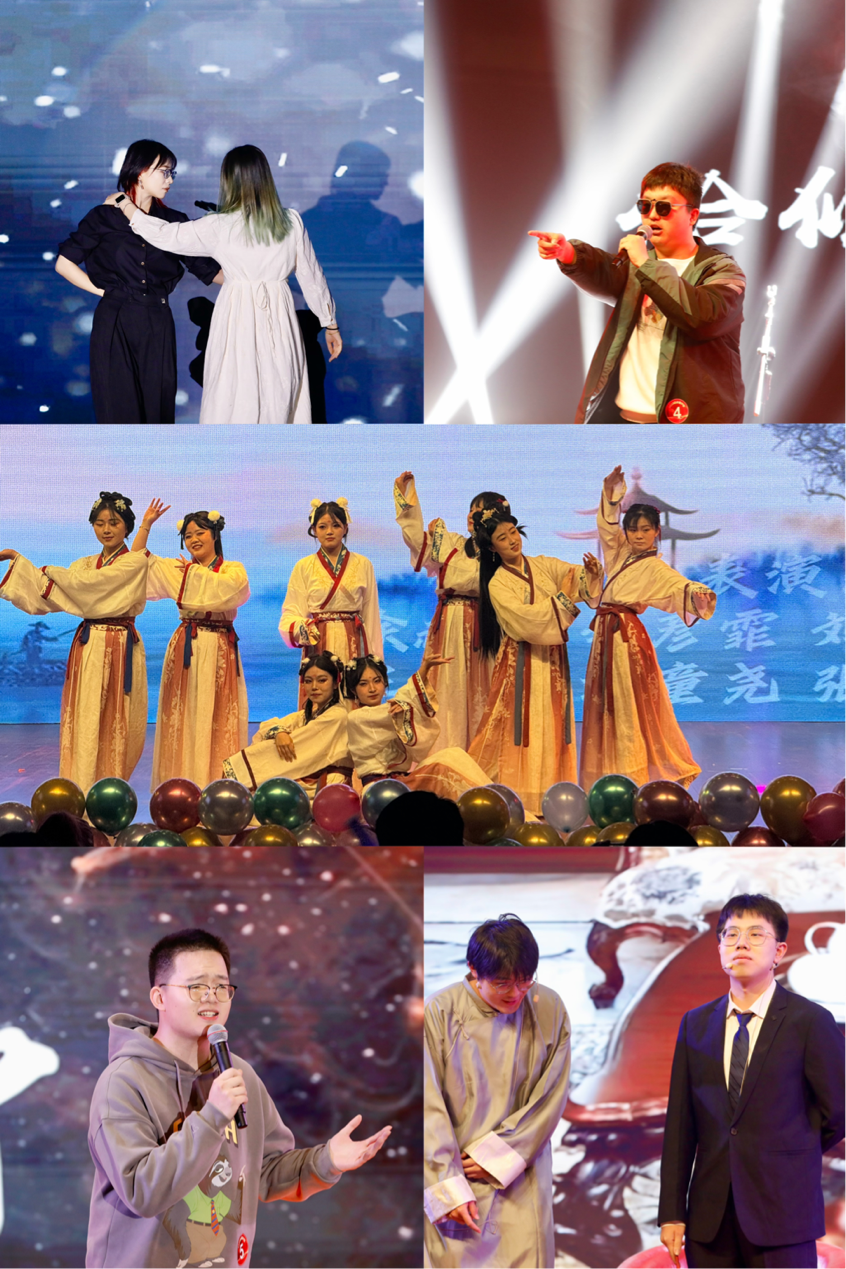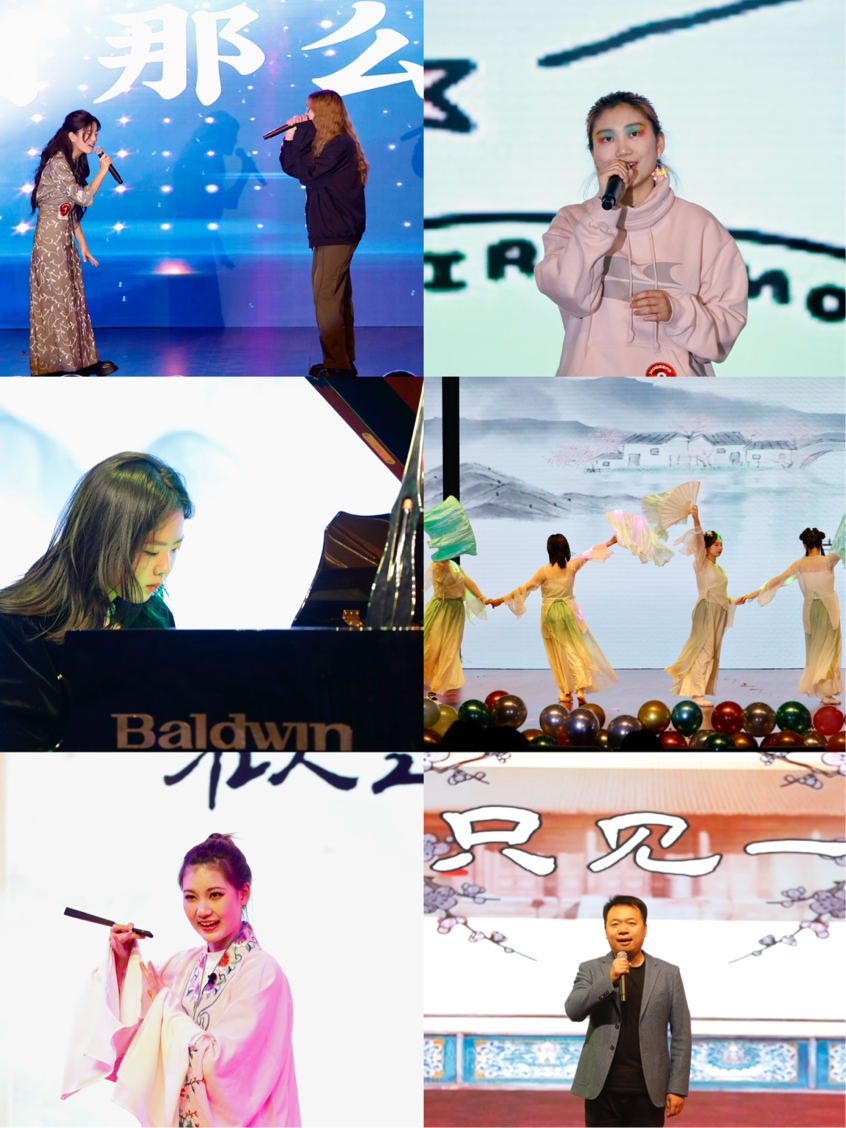 晚会第一篇章,德吉措巴、史凌熙带来歌曲《危险》,向大家诉说永远年轻、永远热烈奔放的青春故事;秦依童的《这世界那么多人》,把心底的柔软和温暖娓娓道来;钢琴曲《浏阳河》在王姝涵的指尖跃动而出,搭配上徐赫杨、李彦霏等同学的柔美舞蹈,灵动婉转;戏曲串烧《花雅合韵》,张天翊同学的《游园惊梦》和学院党委副书记张伟的《锁麟囊》在抑扬顿挫之中把传统戏曲的魅力体现得淋漓尽致。