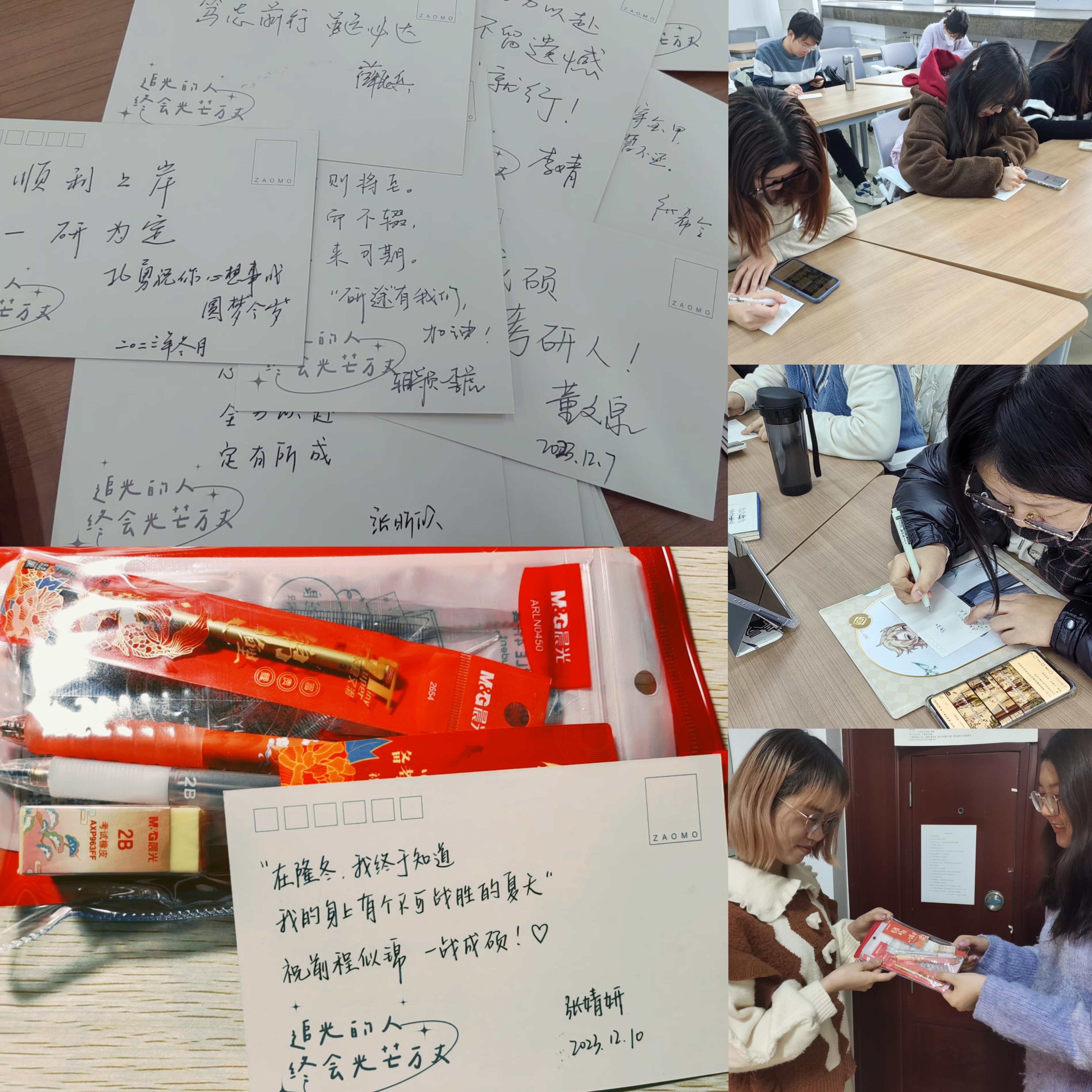12月是考研冲刺月,历史文化学院本科生党支部与学院机关党支部联合开展为考研学子送祝福活动。本科2020级共有40余名同学报考了2023年硕士研究生考试,备战已久即将步入考场。为支持和鼓励考研学子自信迎接考试,老师和同学们为考研学子们购买了考试文具,撰写了加油卡片,共同送上关心与祝福。