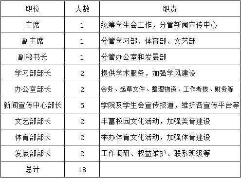 另外,学院社团联合会设置负责人3人,青年志愿者协会设置负责人3人。