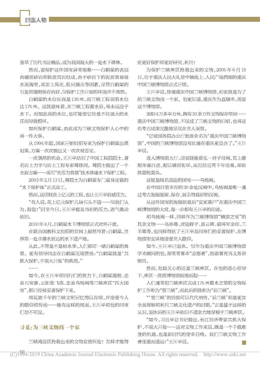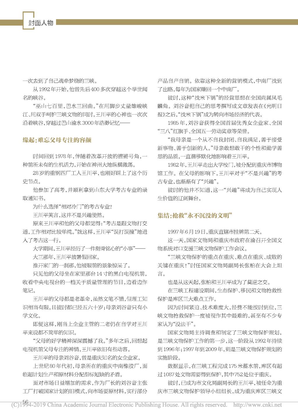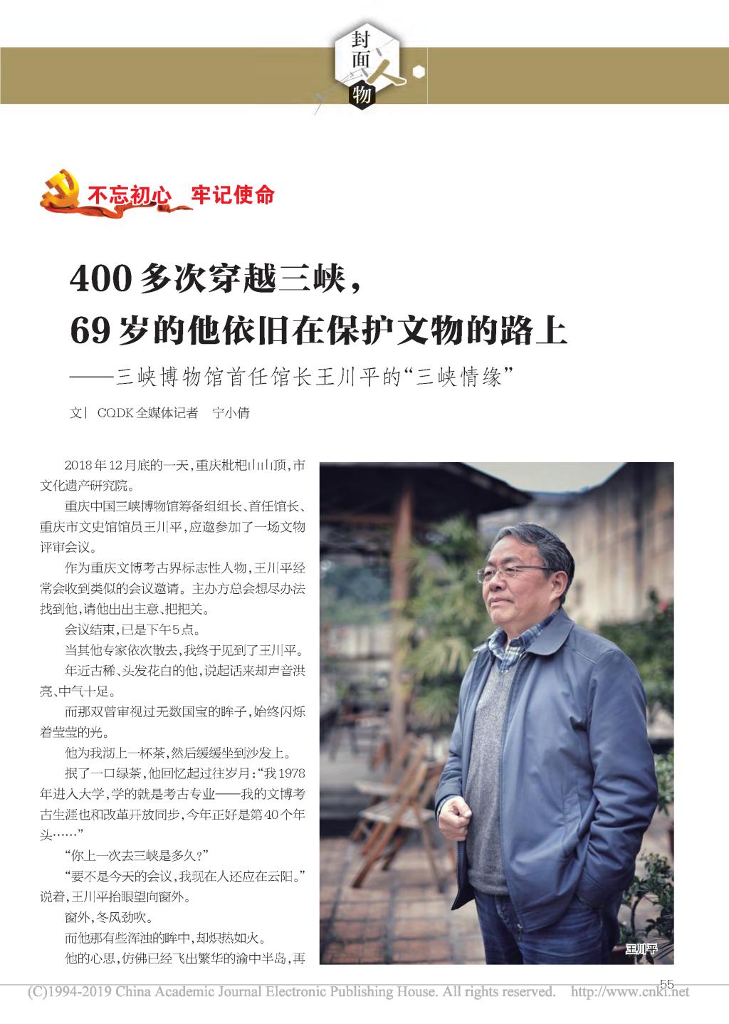 编者按:王川平是太阳成tyc122cc集团考古专业78级校友,著名考古文博专家,曾任三峡博物馆首任馆长,他为保护三峡文物曾400多次穿越三峡。七一网(中共重庆市委党建门户)、《当代党员》杂志(中共重庆市委主管、主办的综合性机关刊物)曾对其进行专访并以“封面人物”形式发表《三峡博物馆首任馆长王川平的“三峡情缘”》。本站转载这份专访稿,讲述王川平校友奋斗报国的生动事迹,希望同学们透过校友的故事,感受其作为山大历史人不忘初心、牢记使命的情怀和专业精神,不断坚定“成才报国”信念。