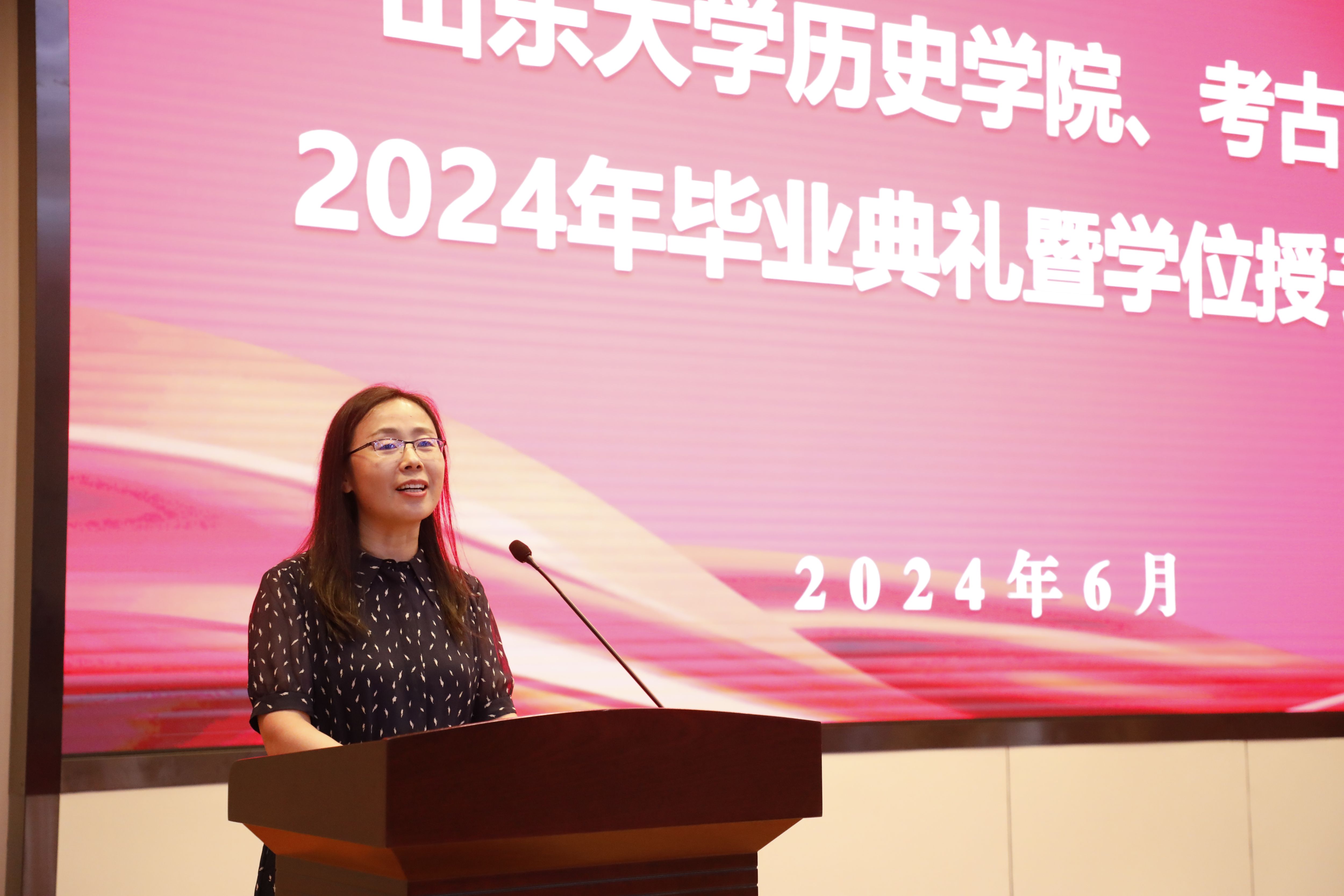 考古学院2000级考古学专业校友,第十七届中国青年科技奖、第十七届中国青年女科学家奖、长江学者奖励计划青年学者、兰州大学资源环境学院张东菊教授在发言中回顾了自己在山大的求学经历,对毕业生们表达了诚挚感谢和美好祝福,希望毕业生们带着山大给予的底气和勇气,在未来道路上心无旁骛、专心致志,遇到困难不要迟疑、不要退缩,专心走路、踏实走路,以自己的方式为山大增光添彩,成就理想和事业。