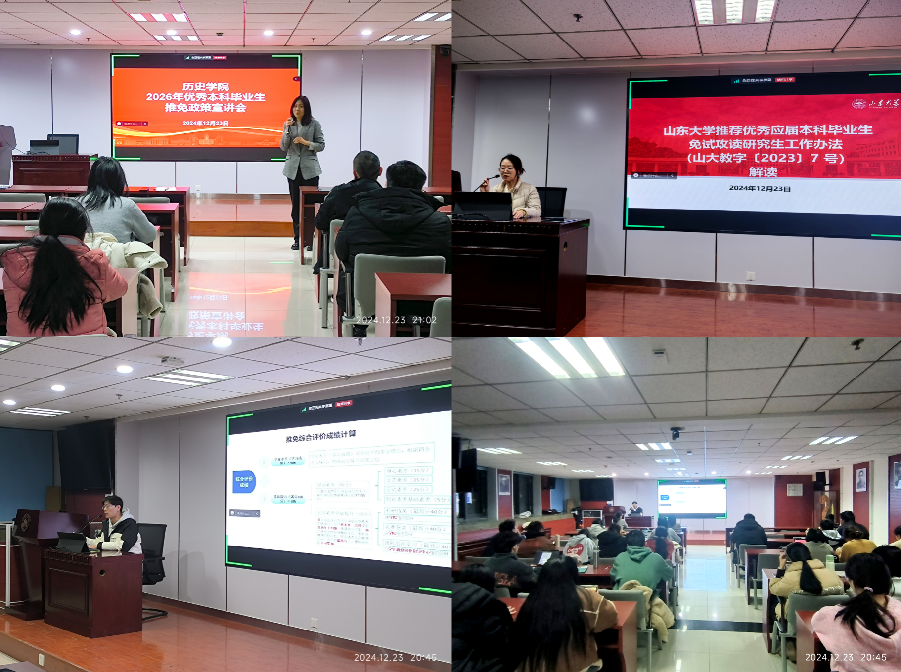2024年12月23日,太阳成集团tyc122ccvip在中心校区知新楼A1017举办2026年推免政策宣讲会,会议旨在落实学校对推免工作的新精神、新要求,让学生熟悉最新推免政策,了解推免工作流程。学院本科教学副院长曲春梅、党委副书记李一楠、各学系主任、2022级历史班和档案班班主任、本科教学秘书张元元以及2022年历史学和档案学专业全体学生参会。宣讲会由2022级辅导员李虎主持。
